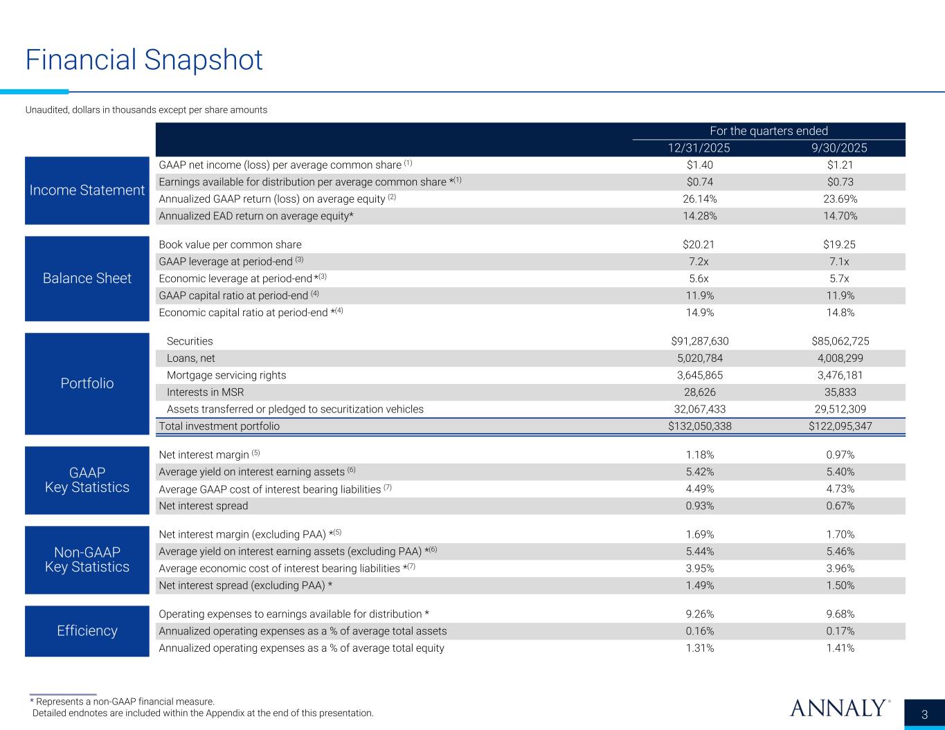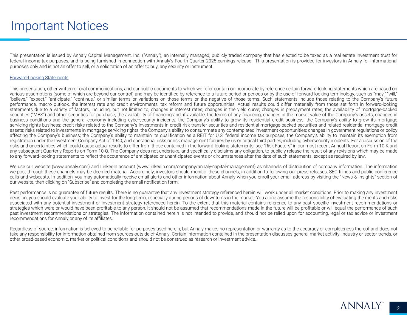 Important Notices This presentation is issued by Annaly Capital Management, Inc. ("Annaly"), an internally managed, publicly traded company that has elected to be taxed as a real estate investment trust for federal income tax purposes, and is being furnished in connection with Annaly’s Fourth Quarter 2025 earnings release. This presentation is provided for investors in Annaly for informational purposes only and is not an offer to sell, or a solicitation of an offer to buy, any security or instrument. Forward-Looking Statements This presentation, other written or oral communications, and our public documents to which we refer contain or incorporate by reference certain forward-looking statements which are based on various assumptions (some of which are beyond our control) and may be identified by reference to a future period or periods or by the use of forward-looking terminology, such as “may,” “will,” “believe,” “expect,” “anticipate,” “continue,” or similar terms or variations on those terms or the negative of those terms. Such statements include those relating to the Company’s future performance, macro outlook, the interest rate and credit environments, tax reform and future opportunities. Actual results could differ materially from those set forth in forward-looking statements due to a variety of factors, including, but not limited to, changes in interest rates; changes in the yield curve; changes in prepayment rates; the availability of mortgage-backed securities (“MBS”) and other securities for purchase; the availability of financing and, if available, the terms of any financing; changes in the market value of the Company’s assets; changes in business conditions and the general economy including cybersecurity incidents; the Company’s ability to grow its residential credit business; the Company's ability to grow its mortgage servicing rights business; credit risks related to the Company’s investments in credit risk transfer securities and residential mortgage-backed securities and related residential mortgage credit assets; risks related to investments in mortgage servicing rights; the Company’s ability to consummate any contemplated investment opportunities; changes in government regulations or policy affecting the Company’s business; the Company’s ability to maintain its qualification as a REIT for U.S. federal income tax purposes; the Company’s ability to maintain its exemption from registration under the Investment Company Act of 1940; and operational risks or risk management failures by us or critical third parties, including cybersecurity incidents. For a discussion of the risks and uncertainties which could cause actual results to differ from those contained in the forward-looking statements, see “Risk Factors” in our most recent Annual Report on Form 10-K and any subsequent Quarterly Reports on Form 10-Q. The Company does not undertake, and specifically disclaims any obligation, to publicly release the result of any revisions which may be made to any forward-looking statements to reflect the occurrence of anticipated or unanticipated events or circumstances after the date of such statements, except as required by law. We use our website (www.annaly.com) and LinkedIn account (www.linkedin.com/company/annaly-capital-management) as channels of distribution of company information. The information we post through these channels may be deemed material. Accordingly, investors should monitor these channels, in addition to following our press releases, SEC filings and public conference calls and webcasts. In addition, you may automatically receive email alerts and other information about Annaly when you enroll your email address by visiting the "News & Insights" section of our website, then clicking on "Subscribe" and completing the email notification form. Past performance is no guarantee of future results. There is no guarantee that any investment strategy referenced herein will work under all market conditions. Prior to making any investment decision, you should evaluate your ability to invest for the long-term, especially during periods of downturns in the market. You alone assume the responsibility of evaluating the merits and risks associated with any potential investment or investment strategy referenced herein. To the extent that this material contains reference to any past specific investment recommendations or strategies which were or would have been profitable to any person, it should not be assumed that recommendations made in the future will be profitable or will equal the performance of such past investment recommendations or strategies. The information contained herein is not intended to provide, and should not be relied upon for accounting, legal or tax advice or investment recommendations for Annaly or any of its affiliates. Regardless of source, information is believed to be reliable for purposes used herein, but Annaly makes no representation or warranty as to the accuracy or completeness thereof and does not take any responsibility for information obtained from sources outside of Annaly. Certain information contained in the presentation discusses general market activity, industry or sector trends, or other broad-based economic, market or political conditions and should not be construed as research or investment advice. 2