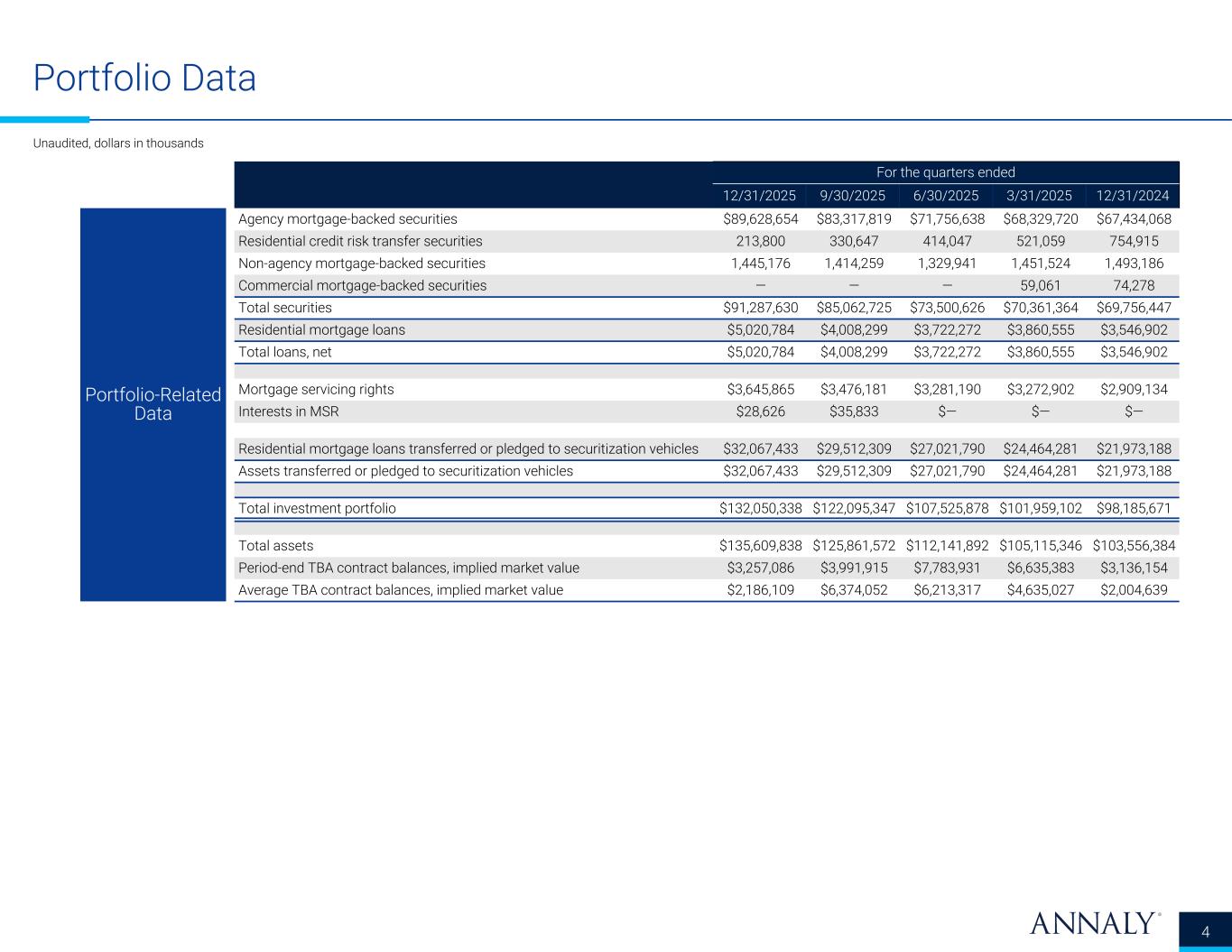Portfolio Data 4 Unaudited, dollars in thousands For the quarters ended 12/31/2025 9/30/2025 6/30/2025 3/31/2025 12/31/2024 Portfolio-Related Data Agency mortgage-backed securities $89,628,654 $83,317,819 $71,756,638 $68,329,720 $67,434,068 Residential credit risk transfer securities 213,800 330,647 414,047 521,059 754,915 Non-agency mortgage-backed securities 1,445,176 1,414,259 1,329,941 1,451,524 1,493,186 Commercial mortgage-backed securities — — — 59,061 74,278 Total securities $91,287,630 $85,062,725 $73,500,626 $70,361,364 $69,756,447 Residential mortgage loans $5,020,784 $4,008,299 $3,722,272 $3,860,555 $3,546,902 Total loans, net $5,020,784 $4,008,299 $3,722,272 $3,860,555 $3,546,902 Mortgage servicing rights $3,645,865 $3,476,181 $3,281,190 $3,272,902 $2,909,134 Interests in MSR $28,626 $35,833 $— $— $— Residential mortgage loans transferred or pledged to securitization vehicles $32,067,433 $29,512,309 $27,021,790 $24,464,281 $21,973,188 Assets transferred or pledged to securitization vehicles $32,067,433 $29,512,309 $27,021,790 $24,464,281 $21,973,188 Total investment portfolio $132,050,338 $122,095,347 $107,525,878 $101,959,102 $98,185,671 Total assets $135,609,838 $125,861,572 $112,141,892 $105,115,346 $103,556,384 Period-end TBA contract balances, implied market value $3,257,086 $3,991,915 $7,783,931 $6,635,383 $3,136,154 Average TBA contract balances, implied market value $2,186,109 $6,374,052 $6,213,317 $4,635,027 $2,004,639