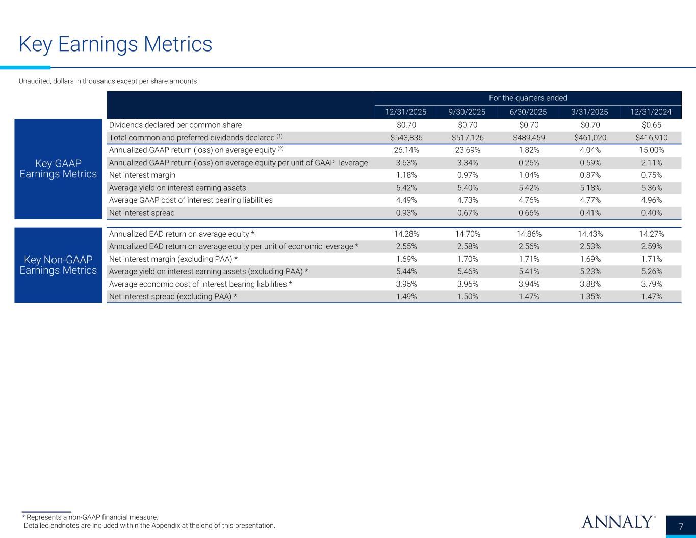 Income Statement Data 6 Summary Income Statement For the quarters ended 12/31/2025 9/30/2025 6/30/2025 3/31/2025 12/31/2024 Total interest income $1,690,707 $1,532,497 $1,418,893 $1,317,108 $1,338,880 Total interest expense 1,324,128 1,256,747 1,145,693 1,097,137 1,151,592 Net interest income $366,579 $275,750 $273,200 $219,971 $187,288 Total economic interest expense *(1) $1,164,155 $1,051,717 $947,828 $892,748 $879,287 Economic net interest income * $526,552 $480,780 $471,065 $424,360 $459,593 Total interest income (excluding PAA) * $1,697,334 $1,550,887 $1,415,031 $1,329,404 $1,313,593 Economic net interest income (excluding PAA) * $533,179 $499,170 $467,203 $436,656 $434,306 GAAP net income (loss) $1,017,951 $843,063 $60,371 $130,305 $473,076 GAAP net income (loss) available (related) to common stockholders (2) $971,107 $791,318 $19,839 $87,067 $443,348 GAAP net income (loss) per average common share (2) $1.40 $1.21 $0.03 $0.15 $0.78 Earnings available for distribution * $553,218 $519,882 $489,906 $461,857 $447,015 Earnings available for distribution attributable to common stockholders *(2) $510,831 $478,755 $452,646 $424,700 $408,311 Earnings available for distribution per average common share *(2) $0.74 $0.73 $0.73 $0.72 $0.72 PAA cost (benefit) $6,627 $18,390 ($3,862) $12,296 ($25,287) Weighted average experienced CPR for the period 9.7% 8.6% 8.7% 7.1% 8.7% Weighted average projected long-term CPR at period-end 10.8% 10.4% 9.1% 9.5% 8.6% ___________________ * Represents a non-GAAP financial measure. Detailed endnotes are included within the Appendix at the end of this presentation. Unaudited, dollars in thousands except per share amounts