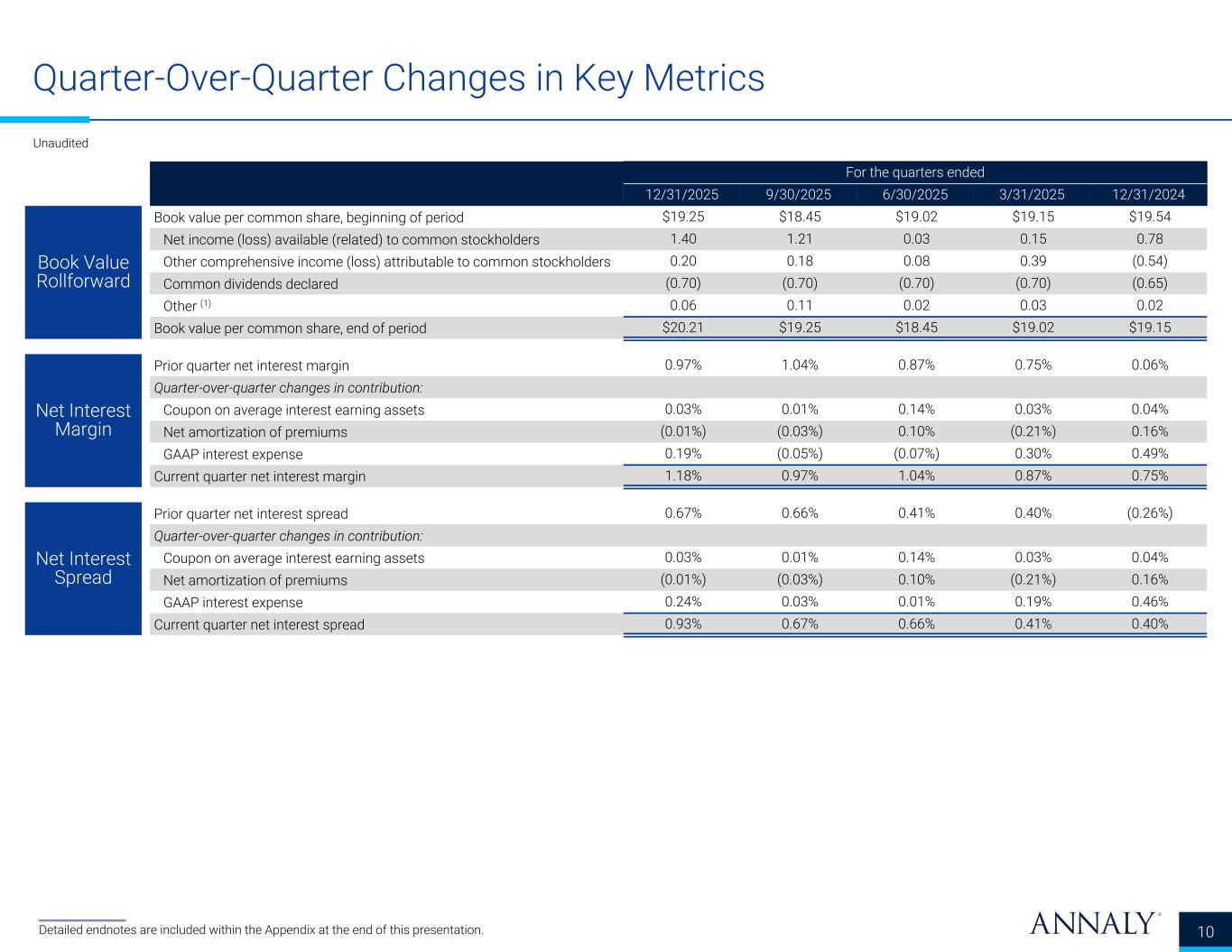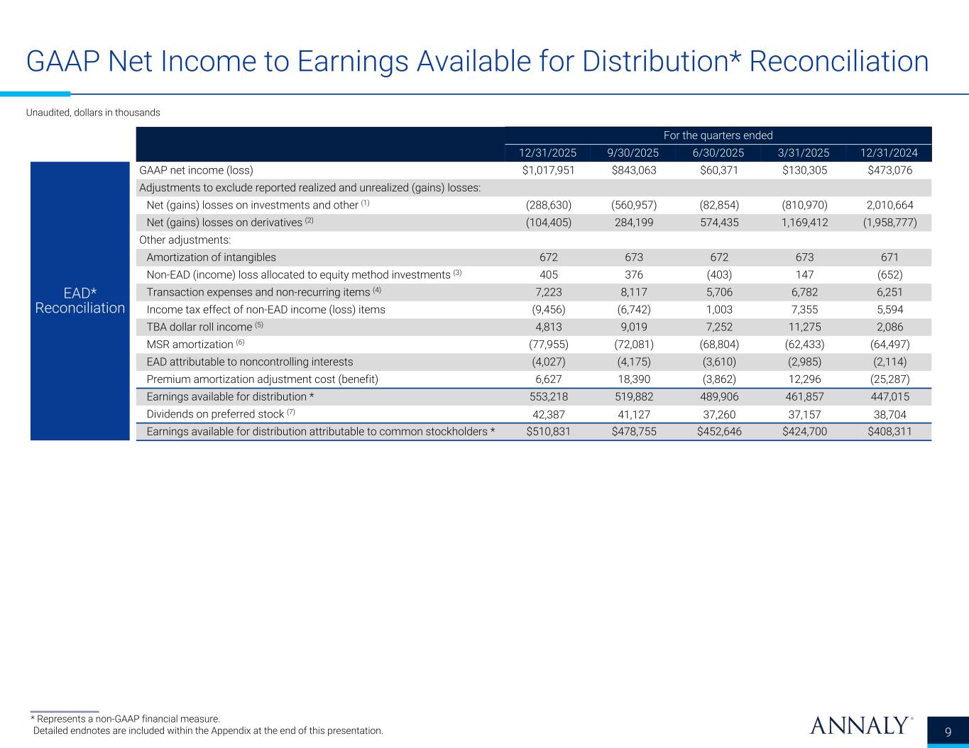 GAAP Net Income to Earnings Available for Distribution* Reconciliation 9 ___________________ * Represents a non-GAAP financial measure. Detailed endnotes are included within the Appendix at the end of this presentation. Unaudited, dollars in thousands For the quarters ended 12/31/2025 9/30/2025 6/30/2025 3/31/2025 12/31/2024 EAD* Reconciliation GAAP net income (loss) $1,017,951 $843,063 $60,371 $130,305 $473,076 Adjustments to exclude reported realized and unrealized (gains) losses: Net (gains) losses on investments and other (1) (288,630) (560,957) (82,854) (810,970) 2,010,664 Net (gains) losses on derivatives (2) (104,405) 284,199 574,435 1,169,412 (1,958,777) Other adjustments: Amortization of intangibles 672 673 672 673 671 Non-EAD (income) loss allocated to equity method investments (3) 405 376 (403) 147 (652) Transaction expenses and non-recurring items (4) 7,223 8,117 5,706 6,782 6,251 Income tax effect of non-EAD income (loss) items (9,456) (6,742) 1,003 7,355 5,594 TBA dollar roll income (5) 4,813 9,019 7,252 11,275 2,086 MSR amortization (6) (77,955) (72,081) (68,804) (62,433) (64,497) EAD attributable to noncontrolling interests (4,027) (4,175) (3,610) (2,985) (2,114) Premium amortization adjustment cost (benefit) 6,627 18,390 (3,862) 12,296 (25,287) Earnings available for distribution * 553,218 519,882 489,906 461,857 447,015 Dividends on preferred stock (7) 42,387 41,127 37,260 37,157 38,704 Earnings available for distribution attributable to common stockholders * $510,831 $478,755 $452,646 $424,700 $408,311