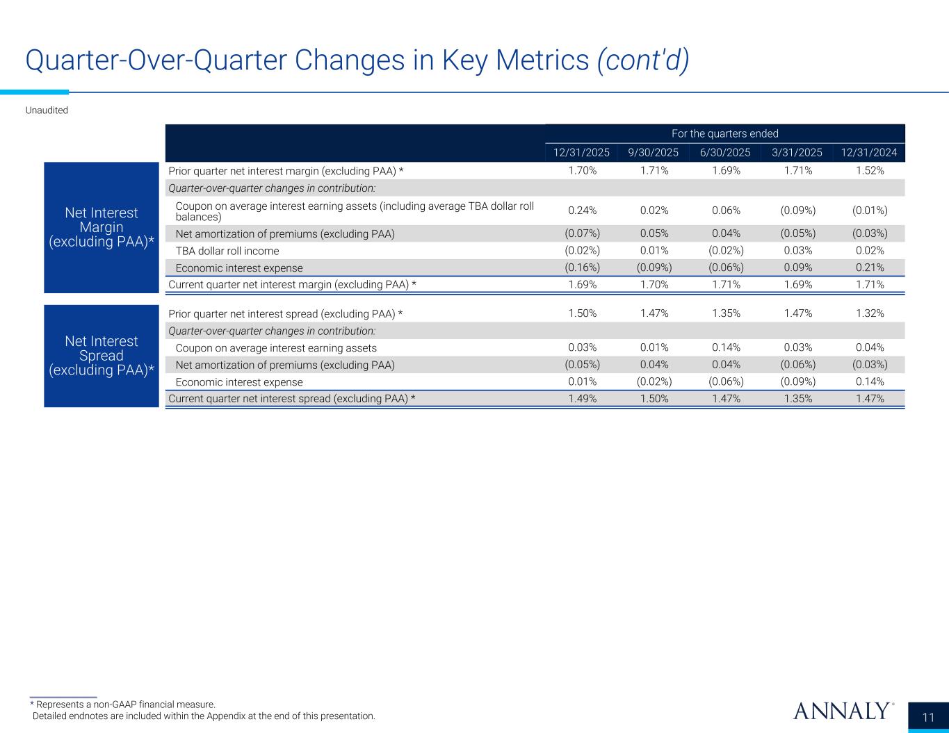Quarter-Over-Quarter Changes in Key Metrics 10 Unaudited ___________________ Detailed endnotes are included within the Appendix at the end of this presentation. For the quarters ended 12/31/2025 9/30/2025 6/30/2025 3/31/2025 12/31/2024 Book Value Rollforward Book value per common share, beginning of period $19.25 $18.45 $19.02 $19.15 $19.54 Net income (loss) available (related) to common stockholders 1.40 1.21 0.03 0.15 0.78 Other comprehensive income (loss) attributable to common stockholders 0.20 0.18 0.08 0.39 (0.54) Common dividends declared (0.70) (0.70) (0.70) (0.70) (0.65) Other (1) 0.06 0.11 0.02 0.03 0.02 Book value per common share, end of period $20.21 $19.25 $18.45 $19.02 $19.15 Net Interest Margin Prior quarter net interest margin 0.97% 1.04% 0.87% 0.75% 0.06% Quarter-over-quarter changes in contribution: Coupon on average interest earning assets 0.03% 0.01% 0.14% 0.03% 0.04% Net amortization of premiums (0.01%) (0.03%) 0.10% (0.21%) 0.16% GAAP interest expense 0.19% (0.05%) (0.07%) 0.30% 0.49% Current quarter net interest margin 1.18% 0.97% 1.04% 0.87% 0.75% Net Interest Spread Prior quarter net interest spread 0.67% 0.66% 0.41% 0.40% (0.26%) Quarter-over-quarter changes in contribution: Coupon on average interest earning assets 0.03% 0.01% 0.14% 0.03% 0.04% Net amortization of premiums (0.01%) (0.03%) 0.10% (0.21%) 0.16% GAAP interest expense 0.24% 0.03% 0.01% 0.19% 0.46% Current quarter net interest spread 0.93% 0.67% 0.66% 0.41% 0.40%