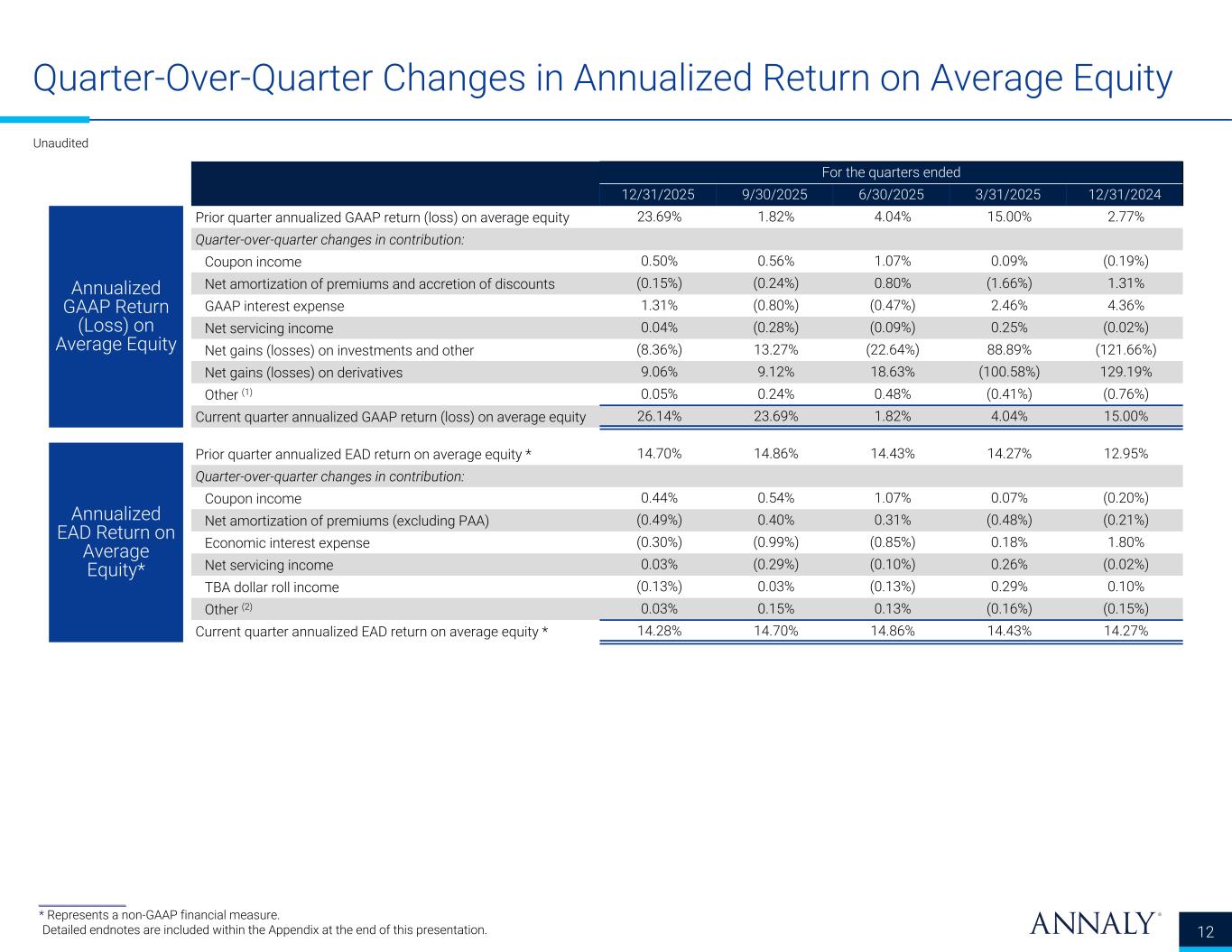 Quarter-Over-Quarter Changes in Key Metrics (cont'd) 11 Unaudited ___________________ * Represents a non-GAAP financial measure. Detailed endnotes are included within the Appendix at the end of this presentation. For the quarters ended 12/31/2025 9/30/2025 6/30/2025 3/31/2025 12/31/2024 Net Interest Margin (excluding PAA)* Prior quarter net interest margin (excluding PAA) * 1.70% 1.71% 1.69% 1.71% 1.52% Quarter-over-quarter changes in contribution: Coupon on average interest earning assets (including average TBA dollar roll balances) 0.24% 0.02% 0.06% (0.09%) (0.01%) Net amortization of premiums (excluding PAA) (0.07%) 0.05% 0.04% (0.05%) (0.03%) TBA dollar roll income (0.02%) 0.01% (0.02%) 0.03% 0.02% Economic interest expense (0.16%) (0.09%) (0.06%) 0.09% 0.21% Current quarter net interest margin (excluding PAA) * 1.69% 1.70% 1.71% 1.69% 1.71% Net Interest Spread (excluding PAA)* Prior quarter net interest spread (excluding PAA) * 1.50% 1.47% 1.35% 1.47% 1.32% Quarter-over-quarter changes in contribution: Coupon on average interest earning assets 0.03% 0.01% 0.14% 0.03% 0.04% Net amortization of premiums (excluding PAA) (0.05%) 0.04% 0.04% (0.06%) (0.03%) Economic interest expense 0.01% (0.02%) (0.06%) (0.09%) 0.14% Current quarter net interest spread (excluding PAA) * 1.49% 1.50% 1.47% 1.35% 1.47%