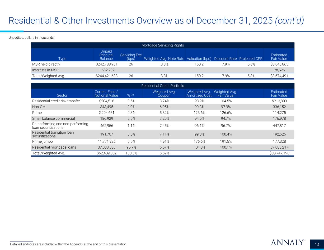 Residential & Other Investments Overview as of December 31, 2025 13 ___________________ Detailed endnotes are included within the Appendix at the end of this presentation. Unaudited, dollars in thousands Agency Fixed-Rate Securities (Pools) (1) Original Weighted Avg. Years to Maturity Current Face Value % (3) Weighted Avg. Coupon Weighted Avg. Amortized Cost Weighted Avg. Fair Value Weighted Avg. 3-Month CPR Estimated Fair Value >=30 years (2) $81,294,269 100.0% 5.14% 100.4% 100.8% 9.7% $81,984,290 Total/Weighted Avg. $81,294,269 100.0% 5.14% 100.4% 100.8% 9.7% $81,984,290 Other Agency Securities Type Current Face Value % (3) Weighted Avg. Coupon Weighted Avg. Amortized Cost Weighted Avg. Fair Value Weighted Avg. 3-Month CPR Estimated Fair Value Multifamily $6,283,600 98.2% 4.65% 100.7% 101.2% —% $6,359,960 Adjustable-rate 114,642 1.8% 6.06% 105.8% 103.8% 19.8% 119,052 Total/Weighted Avg. $6,398,242 100.0% 4.68% 100.8% 101.3% 19.8% $6,479,012 Agency Interest-Only Collateralized Mortgage-Backed Obligations Type Current Notional Value % (4) Weighted Avg. Coupon Weighted Avg. Amortized Cost Weighted Avg. Fair Value Weighted Avg. 3-Month CPR Estimated Fair Value Interest-only $1,309,935 3.3% 3.44% 17.9% 17.4% 6.5% $228,371 Inverse interest-only 3,956,652 9.8% 2.19% 11.3% 9.7% 9.4% 385,697 Multifamily interest-only 35,026,878 86.9% 0.31% 1.6% 1.6% 0.4% 551,284 Total/Weighted Avg. $40,293,465 100.0% 0.60% 3.1% 2.9% 7.2% $1,165,352