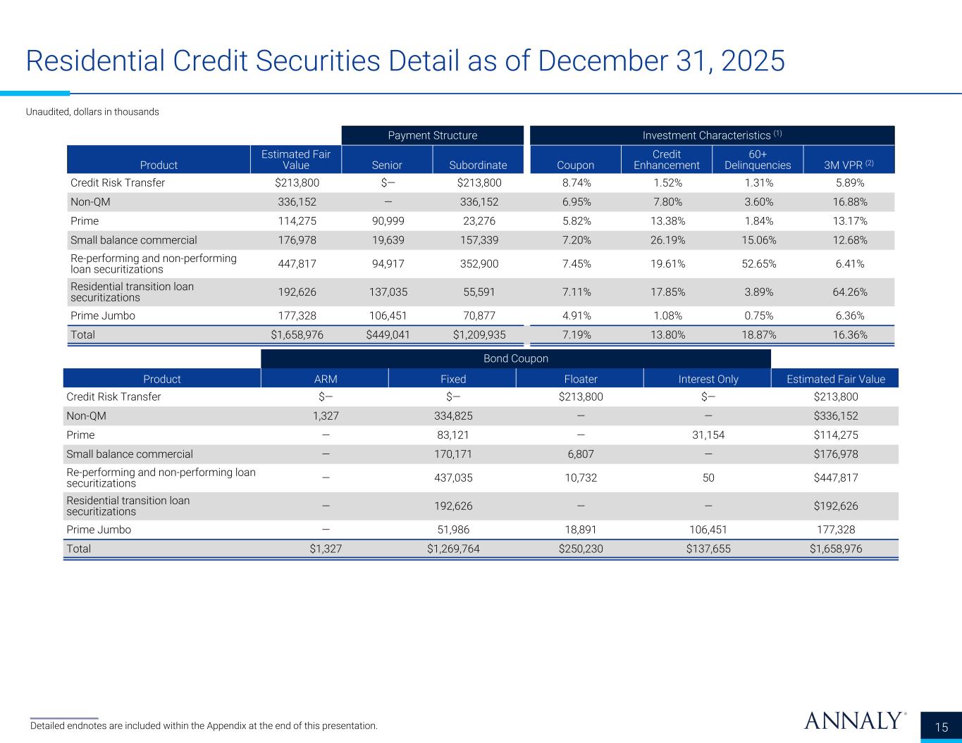 Residential & Other Investments Overview as of December 31, 2025 (cont'd) 14 Unaudited, dollars in thousands ___________________ Detailed endnotes are included within the Appendix at the end of this presentation. Mortgage Servicing Rights Type Unpaid Principal Balance Servicing Fee (bps) Weighted Avg. Note Rate Valuation (bps) Discount Rate Projected CPR Estimated Fair Value MSR held directly $242,788,981 26 3.3% 150.2 7.9% 5.8% $3,645,865 Interests in MSR 1,632,702 28,626 Total/Weighted Avg. $244,421,683 26 3.3% 150.2 7.9% 5.8% $3,674,491 Residential Credit Portfolio Sector Current Face / Notional Value % (1) Weighted Avg. Coupon Weighted Avg. Amortized Cost Weighted Avg. Fair Value Estimated Fair Value Residential credit risk transfer $204,518 0.5% 8.74% 98.9% 104.5% $213,800 Non-QM 343,495 0.9% 6.95% 99.3% 97.9% 336,152 Prime 2,294,631 0.3% 5.82% 123.6% 126.6% 114,275 Small balance commercial 186,929 0.5% 7.20% 94.5% 94.7% 176,978 Re-performing and non-performing loan securitizations 462,956 1.1% 7.45% 96.1% 96.7% 447,817 Residential transition loan securitizations 191,767 0.5% 7.11% 99.8% 100.4% 192,626 Prime jumbo 11,771,926 0.5% 4.91% 176.6% 191.5% 177,328 Residential mortgage loans 37,033,580 95.7% 6.67% 101.3% 100.1% 37,088,217 Total/Weighted Avg. $52,489,802 100.0% 6.69% $38,747,193