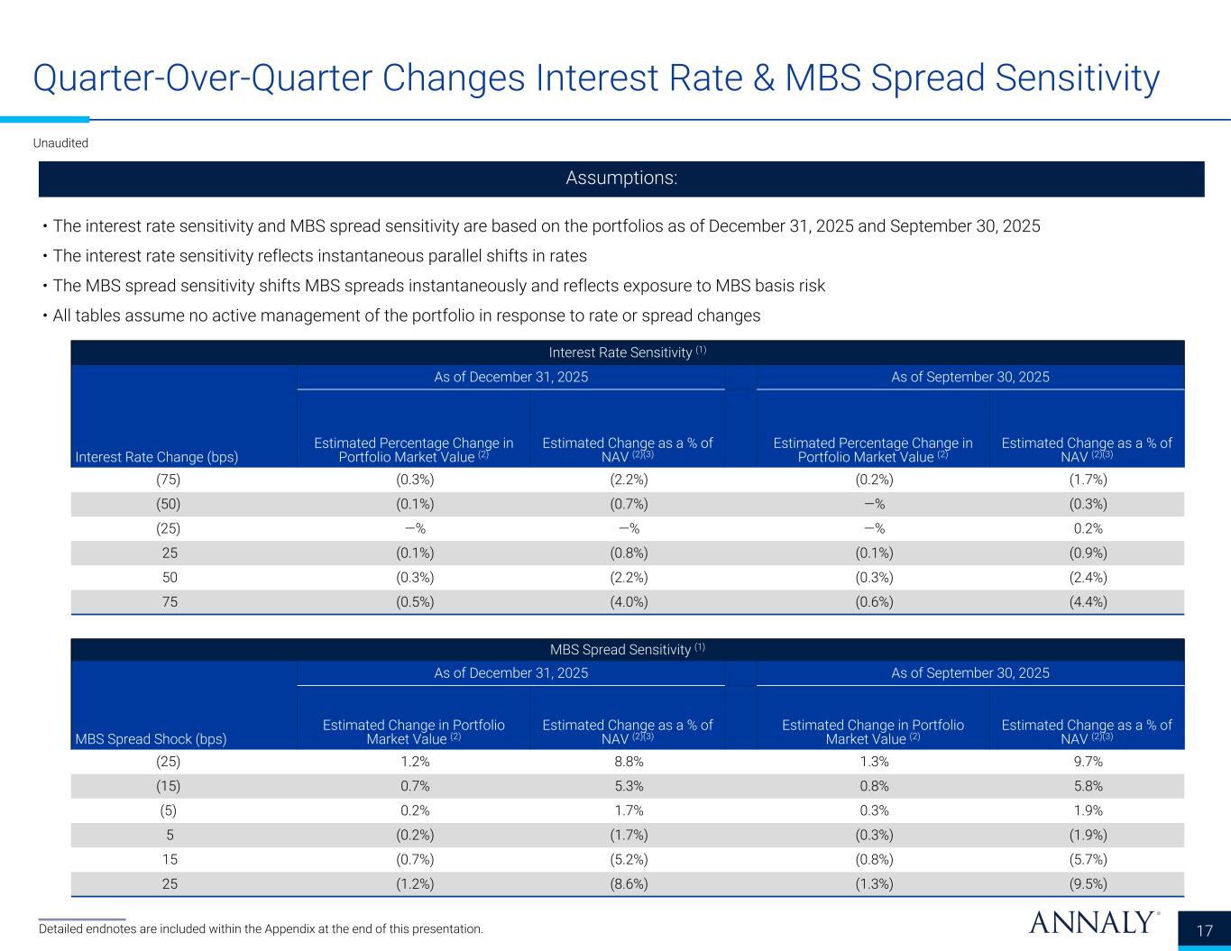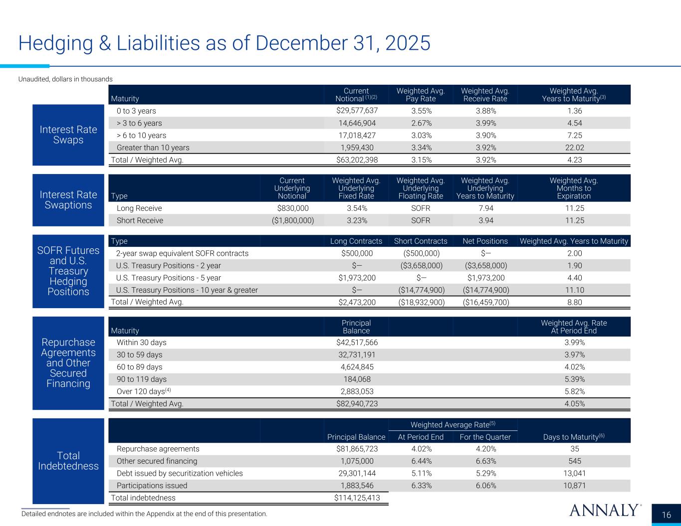 Hedging & Liabilities as of December 31, 2025 16 Unaudited, dollars in thousands ___________________ Detailed endnotes are included within the Appendix at the end of this presentation. Maturity Current Notional (1)(2) Weighted Avg. Pay Rate Weighted Avg. Receive Rate Weighted Avg. Years to Maturity(3) Interest Rate Swaps 0 to 3 years $29,577,637 3.55% 3.88% 1.36 > 3 to 6 years 14,646,904 2.67% 3.99% 4.54 > 6 to 10 years 17,018,427 3.03% 3.90% 7.25 Greater than 10 years 1,959,430 3.34% 3.92% 22.02 Total / Weighted Avg. $63,202,398 3.15% 3.92% 4.23 Interest Rate Swaptions Type Current Underlying Notional Weighted Avg. Underlying Fixed Rate Weighted Avg. Underlying Floating Rate Weighted Avg. Underlying Years to Maturity Weighted Avg. Months to Expiration Long Receive $830,000 3.54% SOFR 7.94 11.25 Short Receive ($1,800,000) 3.23% SOFR 3.94 11.25 SOFR Futures and U.S. Treasury Hedging Positions Type Long Contracts Short Contracts Net Positions Weighted Avg. Years to Maturity 2-year swap equivalent SOFR contracts $500,000 ($500,000) $— 2.00 U.S. Treasury Positions - 2 year $— ($3,658,000) ($3,658,000) 1.90 U.S. Treasury Positions - 5 year $1,973,200 $— $1,973,200 4.40 U.S. Treasury Positions - 10 year & greater $— ($14,774,900) ($14,774,900) 11.10 Total / Weighted Avg. $2,473,200 ($18,932,900) ($16,459,700) 8.80 Repurchase Agreements and Other Secured Financing Maturity Principal Balance Weighted Avg. Rate At Period End Within 30 days $42,517,566 3.99% 30 to 59 days 32,731,191 3.97% 60 to 89 days 4,624,845 4.02% 90 to 119 days 184,068 5.39% Over 120 days(4) 2,883,053 5.82% Total / Weighted Avg. $82,940,723 4.05% Total Indebtedness Principal Balance Weighted Average Rate(5) Days to Maturity(6)At Period End For the Quarter Repurchase agreements $81,865,723 4.02% 4.20% 35 Other secured financing 1,075,000 6.44% 6.63% 545 Debt issued by securitization vehicles 29,301,144 5.11% 5.29% 13,041 Participations issued 1,883,546 6.33% 6.06% 10,871 Total indebtedness $114,125,413