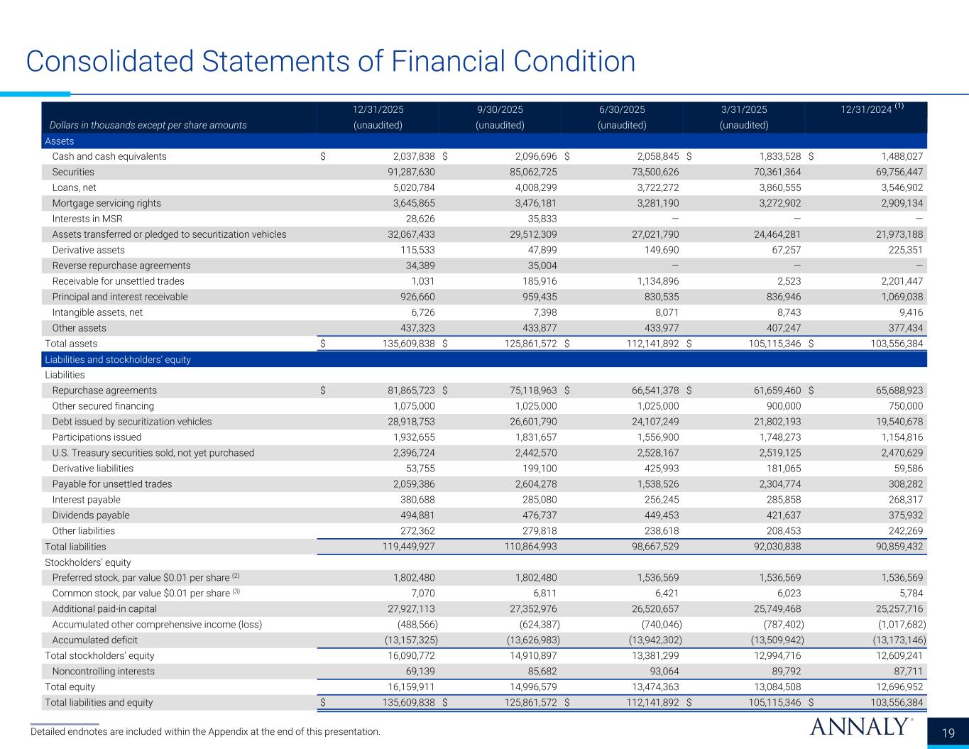 Consolidated Statements of Financial Condition 19 ___________________ Detailed endnotes are included within the Appendix at the end of this presentation. 12/31/2025 9/30/2025 6/30/2025 3/31/2025 12/31/2024 Dollars in thousands except per share amounts (unaudited) (unaudited) (unaudited) (unaudited) Assets Cash and cash equivalents $ 2,037,838 $ 2,096,696 $ 2,058,845 $ 1,833,528 $ 1,488,027 Securities 91,287,630 85,062,725 73,500,626 70,361,364 69,756,447 Loans, net 5,020,784 4,008,299 3,722,272 3,860,555 3,546,902 Mortgage servicing rights 3,645,865 3,476,181 3,281,190 3,272,902 2,909,134 Interests in MSR 28,626 35,833 — — — Assets transferred or pledged to securitization vehicles 32,067,433 29,512,309 27,021,790 24,464,281 21,973,188 Derivative assets 115,533 47,899 149,690 67,257 225,351 Reverse repurchase agreements 34,389 35,004 — — — Receivable for unsettled trades 1,031 185,916 1,134,896 2,523 2,201,447 Principal and interest receivable 926,660 959,435 830,535 836,946 1,069,038 Intangible assets, net 6,726 7,398 8,071 8,743 9,416 Other assets 437,323 433,877 433,977 407,247 377,434 Total assets $ 135,609,838 $ 125,861,572 $ 112,141,892 $ 105,115,346 $ 103,556,384 Liabilities and stockholders’ equity Liabilities Repurchase agreements $ 81,865,723 $ 75,118,963 $ 66,541,378 $ 61,659,460 $ 65,688,923 Other secured financing 1,075,000 1,025,000 1,025,000 900,000 750,000 Debt issued by securitization vehicles 28,918,753 26,601,790 24,107,249 21,802,193 19,540,678 Participations issued 1,932,655 1,831,657 1,556,900 1,748,273 1,154,816 U.S. Treasury securities sold, not yet purchased 2,396,724 2,442,570 2,528,167 2,519,125 2,470,629 Derivative liabilities 53,755 199,100 425,993 181,065 59,586 Payable for unsettled trades 2,059,386 2,604,278 1,538,526 2,304,774 308,282 Interest payable 380,688 285,080 256,245 285,858 268,317 Dividends payable 494,881 476,737 449,453 421,637 375,932 Other liabilities 272,362 279,818 238,618 208,453 242,269 Total liabilities 119,449,927 110,864,993 98,667,529 92,030,838 90,859,432 Stockholders’ equity Preferred stock, par value $0.01 per share (2) 1,802,480 1,802,480 1,536,569 1,536,569 1,536,569 Common stock, par value $0.01 per share (3) 7,070 6,811 6,421 6,023 5,784 Additional paid-in capital 27,927,113 27,352,976 26,520,657 25,749,468 25,257,716 Accumulated other comprehensive income (loss) (488,566) (624,387) (740,046) (787,402) (1,017,682) Accumulated deficit (13,157,325) (13,626,983) (13,942,302) (13,509,942) (13,173,146) Total stockholders’ equity 16,090,772 14,910,897 13,381,299 12,994,716 12,609,241 Noncontrolling interests 69,139 85,682 93,064 89,792 87,711 Total equity 16,159,911 14,996,579 13,474,363 13,084,508 12,696,952 Total liabilities and equity $ 135,609,838 $ 125,861,572 $ 112,141,892 $ 105,115,346 $ 103,556,384 (1)