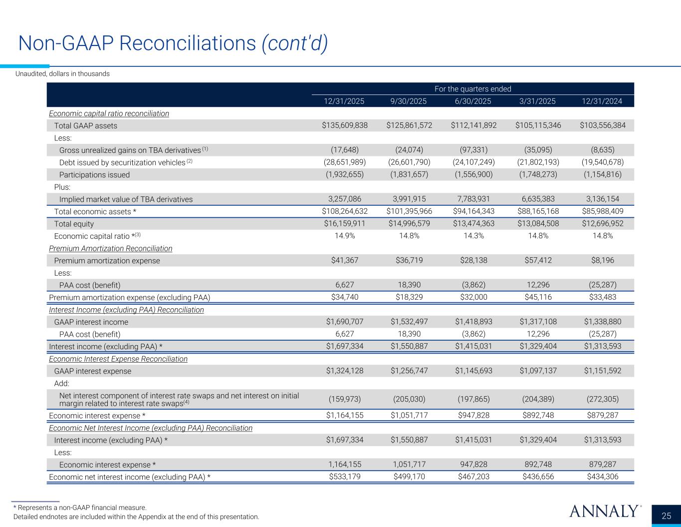 Non-GAAP Reconciliations (cont'd) 24 Unaudited, dollars in thousands For the quarters ended 12/31/2025 9/30/2025 6/30/2025 3/31/2025 12/31/2024 Economic leverage ratio reconciliation Repurchase agreements $81,865,723 $75,118,963 $66,541,378 $61,659,460 $65,688,923 Other secured financing 1,075,000 1,025,000 1,025,000 900,000 750,000 Debt issued by securitization vehicles 28,918,753 26,601,790 24,107,249 21,802,193 19,540,678 Participations issued 1,932,655 1,831,657 1,556,900 1,748,273 1,154,816 U.S. Treasury securities sold, not yet purchased 2,396,724 2,442,570 2,528,167 2,519,125 2,470,629 Total GAAP debt $116,188,855 $107,019,980 $95,758,694 $88,629,051 $89,605,046 Less Non-recourse debt: Debt issued by securitization vehicles (1) ($28,651,989) ($26,601,790) ($24,107,249) ($21,802,193) ($19,540,678) Participations issued (1,932,655) (1,831,657) (1,556,900) (1,748,273) (1,154,816) Total recourse debt $85,604,211 $78,586,533 $70,094,545 $65,078,585 $68,909,552 Plus / (Less): Cost basis of TBA derivatives $3,252,601 $3,981,439 $7,686,600 $6,612,755 $3,158,058 Payable for unsettled trades 2,059,386 2,604,278 1,538,526 2,304,774 308,282 Receivable for unsettled trades (1,031) (185,916) (1,134,896) (2,523) (2,201,447) Economic debt * $90,915,167 $84,986,334 $78,184,775 $73,993,591 $70,174,445 Total equity $16,159,911 $14,996,579 $13,474,363 $13,084,508 $12,696,952 Economic leverage ratio * 5.6x 5.7x 5.8x 5.7x 5.5x ___________________ * Represents a non-GAAP financial measure.