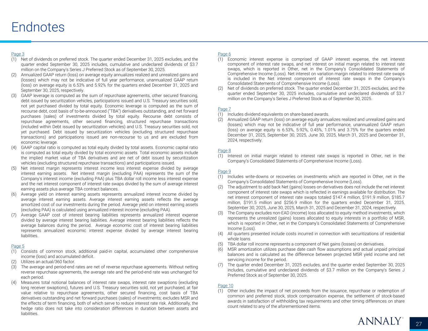 Page 6 (1) Economic interest expense is comprised of GAAP interest expense, the net interest component of interest rate swaps, and net interest on initial margin related to interest rate swaps, which is reported in Other, net in the Company’s Consolidated Statements of Comprehensive Income (Loss). Net interest on variation margin related to interest rate swaps is included in the Net interest component of interest rate swaps in the Company’s Consolidated Statements of Comprehensive Income (Loss). (2) Net of dividends on preferred stock. The quarter ended December 31, 2025 excludes, and the quarter ended September 30, 2025 includes, cumulative and undeclared dividends of $3.7 million on the Company's Series J Preferred Stock as of September 30, 2025. Page 7 (1) Includes dividend equivalents on share-based awards. (2) Annualized GAAP return (loss) on average equity annualizes realized and unrealized gains and (losses) which may not be indicative of full year performance, unannualized GAAP return (loss) on average equity is 6.53%, 5.92%, 0.45%, 1.01% and 3.75% for the quarters ended December 31, 2025, September 30, 2025, June 30, 2025, March 31, 2025 and December 31, 2024, respectively. Page 8 (1) Interest on initial margin related to interest rate swaps is reported in Other, net in the Company’s Consolidated Statements of Comprehensive Income (Loss). Page 9 (1) Includes write-downs or recoveries on investments which are reported in Other, net in the Company's Consolidated Statements of Comprehensive Income (Loss). (2) The adjustment to add back Net (gains) losses on derivatives does not include the net interest component of interest rate swaps which is reflected in earnings available for distribution. The net interest component of interest rate swaps totaled $147.4 million, $191.9 million, $185.7 million, $191.5 million and $256.9 million for the quarters ended December 31, 2025, September 30, 2025, June 30, 2025, March 31, 2025 and December 31, 2024, respectively. (3) The Company excludes non-EAD (income) loss allocated to equity method investments, which represents the unrealized (gains) losses allocated to equity interests in a portfolio of MSR, which is reported in Other, net in the Company’s Consolidated Statements of Comprehensive Income (Loss). (4) All quarters presented include costs incurred in connection with securitizations of residential whole loans. (5) TBA dollar roll income represents a component of Net gains (losses) on derivatives. (6) MSR amortization utilizes purchase date cash flow assumptions and actual unpaid principal balances and is calculated as the difference between projected MSR yield income and net servicing income for the period. (7) The quarter ended December 31, 2025 excludes, and the quarter ended September 30, 2025 includes, cumulative and undeclared dividends of $3.7 million on the Company's Series J Preferred Stock as of September 30, 2025. Page 10 (1) Other includes the impact of net proceeds from the issuance, repurchase or redemption of common and preferred stock, stock compensation expense, the settlement of stock-based awards in satisfaction of withholding tax requirements and other timing differences on share count related to any of the aforementioned items. Endnotes Page 3 (1) Net of dividends on preferred stock. The quarter ended December 31, 2025 excludes, and the quarter ended September 30, 2025 includes, cumulative and undeclared dividends of $3.7 million on the Company's Series J Preferred Stock as of September 30, 2025. (2) Annualized GAAP return (loss) on average equity annualizes realized and unrealized gains and (losses) which may not be indicative of full year performance, unannualized GAAP return (loss) on average equity is 6.53% and 5.92% for the quarters ended December 31, 2025 and September 30, 2025, respectively. (3) GAAP leverage is computed as the sum of repurchase agreements, other secured financing, debt issued by securitization vehicles, participations issued and U.S. Treasury securities sold, not yet purchased divided by total equity. Economic leverage is computed as the sum of recourse debt, cost basis of to-be-announced ("TBA") derivatives outstanding, and net forward purchases (sales) of investments divided by total equity. Recourse debt consists of repurchase agreements, other secured financing, structured repurchase transactions (included within Debt issued by securitization vehicles) and U.S. Treasury securities sold, not yet purchased. Debt issued by securitization vehicles (excluding structured repurchase transactions) and participations issued are non-recourse to us and are excluded from economic leverage. (4) GAAP capital ratio is computed as total equity divided by total assets. Economic capital ratio is computed as total equity divided by total economic assets. Total economic assets include the implied market value of TBA derivatives and are net of debt issued by securitization vehicles (excluding structured repurchase transactions) and participations issued. (5) Net interest margin represents interest income less interest expense divided by average interest earning assets. Net interest margin (excluding PAA) represents the sum of the Company's interest income (excluding PAA) plus TBA dollar roll income less interest expense and the net interest component of interest rate swaps divided by the sum of average interest earning assets plus average TBA contract balances. (6) Average yield on interest earning assets represents annualized interest income divided by average interest earning assets. Average interest earning assets reflects the average amortized cost of our investments during the period. Average yield on interest earning assets (excluding PAA) is calculated using annualized interest income (excluding PAA). (7) Average GAAP cost of interest bearing liabilities represents annualized interest expense divided by average interest bearing liabilities. Average interest bearing liabilities reflects the averag