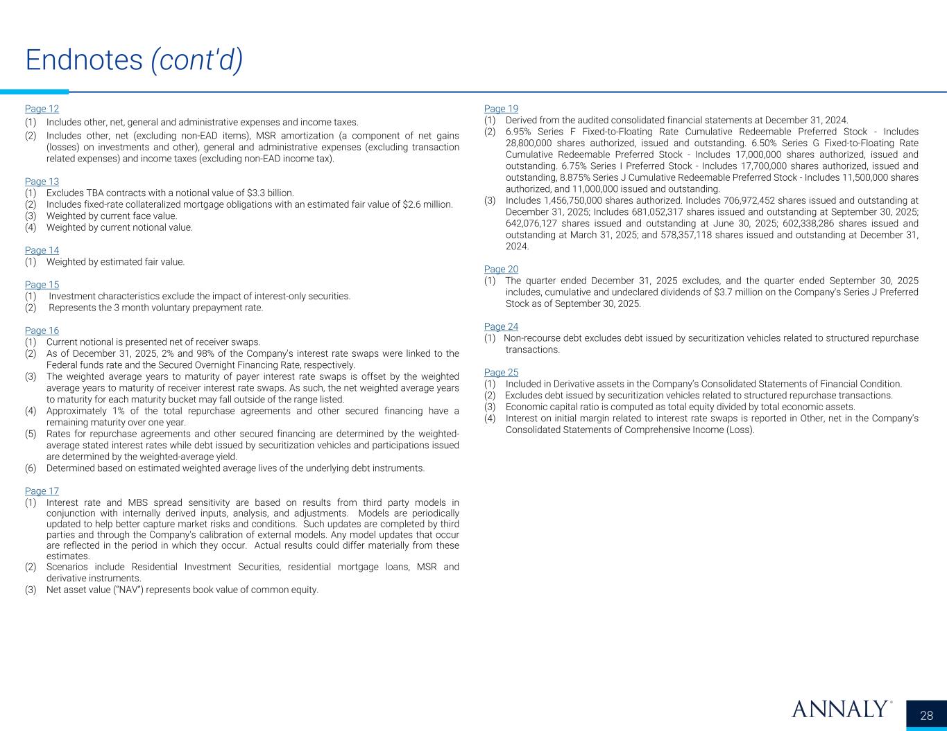 Page 19 (1) Derived from the audited consolidated financial statements at December 31, 2024. (2) 6.95% Series F Fixed-to-Floating Rate Cumulative Redeemable Preferred Stock - Includes 28,800,000 shares authorized, issued and outstanding. 6.50% Series G Fixed-to-Floating Rate Cumulative Redeemable Preferred Stock - Includes 17,000,000 shares authorized, issued and outstanding. 6.75% Series I Preferred Stock - Includes 17,700,000 shares authorized, issued and outstanding, 8.875% Series J Cumulative Redeemable Preferred Stock - Includes 11,500,000 shares authorized, and 11,000,000 issued and outstanding. (3) Includes 1,456,750,000 shares authorized. Includes 706,972,452 shares issued and outstanding at December 31, 2025; Includes 681,052,317 shares issued and outstanding at September 30, 2025; 642,076,127 shares issued and outstanding at June 30, 2025; 602,338,286 shares issued and outstanding at March 31, 2025; and 578,357,118 shares issued and outstanding at December 31, 2024. Page 20 (1) The quarter ended December 31, 2025 excludes, and the quarter ended September 30, 2025 includes, cumulative and undeclared dividends of $3.7 million on the Company's Series J Preferred Stock as of September 30, 2025. Page 24 (1) Non-recourse debt excludes debt issued by securitization vehicles related to structured repurchase transactions. Page 25 (1) Included in Derivative assets in the Company’s Consolidated Statements of Financial Condition. (2) Excludes debt issued by securitization vehicles related to structured repurchase transactions. (3) Economic capital ratio is computed as total equity divided by total economic assets. (4) Interest on initial margin related to interest rate swaps is reported in Other, net in the Company’s Consolidated Statements of Comprehensive Income (Loss). Endnotes (cont'd) 28 Page 12 (1) Includes other, net, general and administrative expenses and income taxes. (2) Includes other, net (excluding non-EAD items), MSR amortization (a component of net gains (losses) on investments and other), general and administrative expenses (excluding transaction related expenses) and income taxes (excluding non-EAD income tax). Page 13 (1) Excludes TBA contracts with a notional value of $3.3 billion. (2) Includes fixed-rate collateralized mortgage obligations with an estimated fair value of $2.6 million. (3) Weighted by current face value. (4) Weighted by current notional value. Page 14 (1) Weighted by estimated fair value. Page 15 (1) Investment characteristics exclude the impact of interest-only securities. (2) Represents the 3 month voluntary prepayment rate. Page 16 (1) Current notional is presented net of receiver swaps. (2) As of December 31, 2025, 2% and 98% of the Company's interest rate swaps were linked to the Federal funds rate and the Secured Overnight Financing Rate, respectively. (3) The weighted average years to maturity of payer interest rate swaps is offset by the weighted average years to maturity of receiver interest rate swaps. As such, the net weighted average years to maturity for each maturity bucket may fall outside of the range listed. (4) Approximately 1% of the total repurchase agreements and other secured financing have a remaining maturity over one year. (5) Rates for repurchase agreements and other secured financing are determined by the weighted- average stated interest rates while debt issued by securitization vehicles and participations issued are determined by the weighted-average yield. (6) Determined based on estimated weighted average lives of the underlying debt instruments. Page 17 (1) Interest rate and MBS spread sensitivity are based on results from third party models in conjunction with internally derived inputs, analysis, and adjustments. Models are periodically updated to help better capture market risks and conditions. Such updates are completed by third parties and through the Company's calibration of external models. Any model updates that occur are reflected in the period in which they occur. Actual results could differ materially from these estimates. (2) Scenarios include Residential Investment Securities, residential mortgage loans, MSR and derivative instruments. (3) Net asset value (“NAV”) represents book value of common equity.
