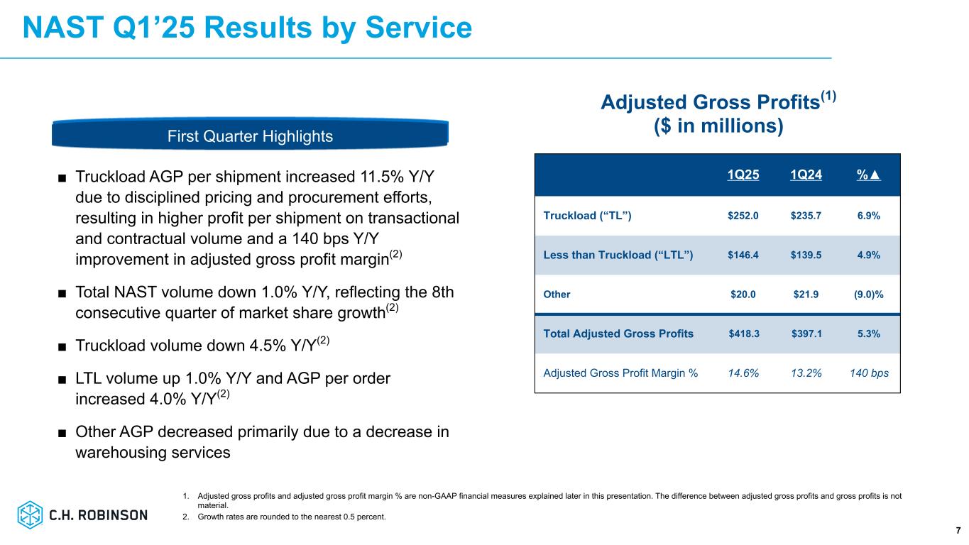 All Other & Corporate ■ Robinson Fresh integrated supply chain solutions generating increased AGP ■ Managed Solutions Q1 AGP down 3.8% Y/Y ■ Other Surface Transportation AGP declined 74.1% Y/Y, due to divestiture of Europe Surface Transportation business Global Forwarding (GF) ■ Ongoing conflict in the Red Sea straining ocean capacity and buoying rates ■ Ocean volume grew 1.5% Y/Y & air tonnage declined 3.0% Y/Y ■ Continuing to diversify our trade lane and industry vertical exposure, which has reduced our exposure in the China to U.S. trade lane North American Surface Transportation (NAST) ■ Adjusted gross profit (AGP) per load/order increased Y/Y in both TL and LTL ■ NAST volume performance outpaced the market indices for the 8th quarter in a row ■ Significant opportunities for profitable growth remain in a highly fragmented market ■ Focused on initiatives that improve the customer and carrier experience and lower our cost to serve ■ Productivity improvements are being driven by removing waste, increasing automation and Gen AI Complementary Global Suite of Services 6 Q1 2025 Adjusted Gross Profits(2) +5.3% Y/Y -13.0% Y/Y +2.5% Y/Y 1. Measured over trailing twelve months. 2. Adjusted gross profits is a non-GAAP financial measure explained later in this presentation. The difference between adjusted gross profits and gross profits is not material. Over half of total revenues is garnered from customers to whom we provide both surface transportation and global forwarding services.(1)