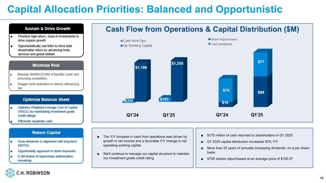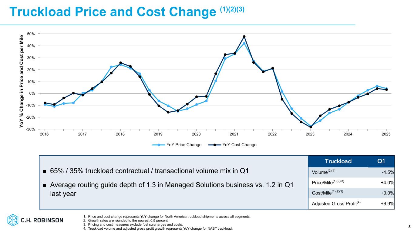 Safe Harbor Statement Except for the historical information contained herein, the matters set forth in this presentation are forward-looking statements that represent our expectations, beliefs, intentions or strategies concerning future events. These forward-looking statements are subject to certain risks and uncertainties that could cause actual results to differ materially from our historical experience or our present expectations, including, but not limited to, factors such as changes in economic conditions, including uncertain consumer demand; changes in market demand and pressures on the pricing for our services; fuel price increases or decreases, or fuel shortages; competition and growth rates within the global logistics industry that could adversely impact our profitability and achieving our long-term growth targets; freight levels and increasing costs and availability of truck capacity or alternative means of transporting freight; risks associated with seasonal changes or significant disruptions in the transportation industry; risks associated with identifying and completing suitable acquisitions; our dependence on and changes in relationships with existing contracted truck, rail, ocean, and air carriers; risks associated with the loss of significant customers; risks associated with reliance on technology to operate our business; cyber-security related risks; our ability to staff and retain employees; risks associated with operations outside of the U.S.; our ability to successfully integrate the operations of acquired companies with our historic operations or efficiently managing divestitures; climate change related risks; risks associated with our indebtedness; risks associated with interest rates; risks associated with litigation, including contingent auto liability and insurance coverage; risks associated with the potential impact of changes in government regulations including environmental-related regulations; risks associated with the changes to income tax regulations; risks associated with the produce industry, including food safety and contamination issues; the impact of changes in political and governmental conditions; changes to our capital structure; changes due to catastrophic events; risks associated with the usage of artificial intelligence technologies; risks associated with cybersecurity events; and other risks and uncertainties detailed in our Annual and Quarterly Reports. Any forward-looking statement speaks only as of the date on which such statement is made, and we undertake no obligation to update such statement to reflect events or circumstances arising after such date. 2©2025 C.H. Robinson Worldwide, Inc. All Rights Reserved.
