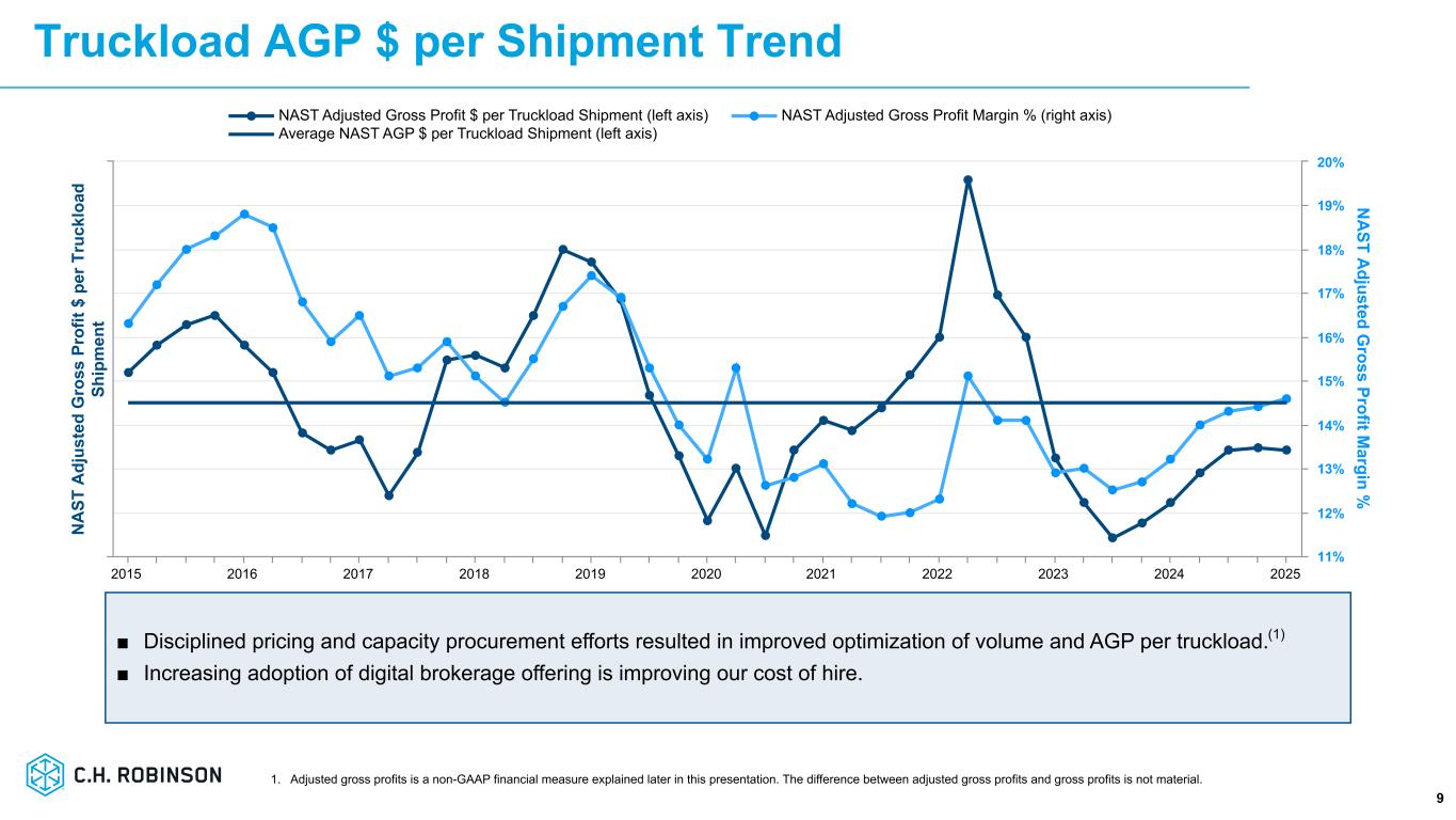 Truckload Price and Cost Change (1)(2)(3) 8 Truckload Q1 Volume(2)(4) -4.5 % Price/Mile(1)(2)(3) +4.0 % Cost/Mile(1)(2)(3) +3.0 % Adjusted Gross Profit(4) +6.9 % 1. Price and cost change represents YoY change for North America truckload shipments across all segments. 2. Growth rates are rounded to the nearest 0.5 percent. 3. Pricing and cost measures exclude fuel surcharges and costs. 4. Truckload volume and adjusted gross profit growth represents YoY change for NAST truckload. ■ 65% / 35% truckload contractual / transactional volume mix in Q1 ■ Average routing guide depth of 1.3 in Managed Solutions business vs. 1.2 in Q1 last year Yo Y % C ha ng e in P ric e an d C os t p er M ile YoY Price Change YoY Cost Change 2016 2017 2018 2019 2020 2021 2022 2023 2024 2025 -30% -20% -10% 0% 10% 20% 30% 40% 50%