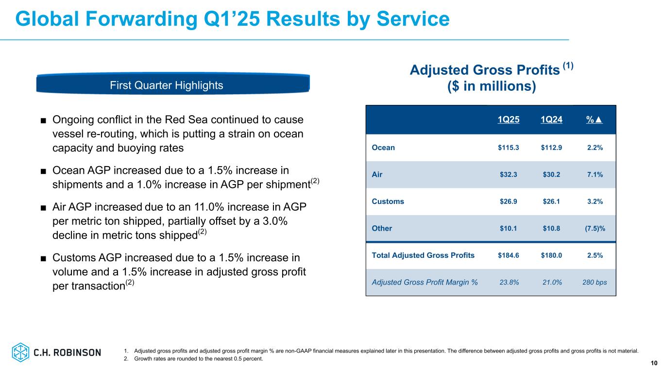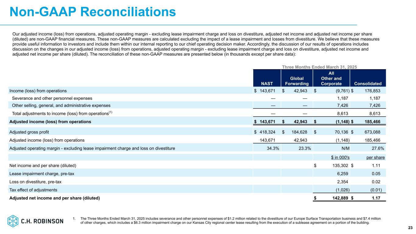 Non-GAAP Reconciliations 24 Our adjusted income (loss) from operations, adjusted operating margin - excluding restructuring, adjusted net income and adjusted net income per share (diluted) are non-GAAP financial measures. These non-GAAP measures are calculated excluding the impact of restructuring. We believe that these measures provide useful information to investors and include them within our internal reporting to our chief operating decision maker. Accordingly, the discussion of our results of operations includes discussion on the changes in our adjusted income (loss) from operations, adjusted operating margin - excluding restructuring, adjusted net income and adjusted net income per share (diluted). The reconciliation of these non-GAAP measures are presented below (in thousands except per share data): Three Months Ended March 31, 2024 NAST Global Forwarding All Other and Corporate Consolidated Income (loss) from operations $ 108,895 $ 31,552 $ (13,314) $ 127,133 Severance and other personnel expenses 3,026 3,215 1,701 7,942 Other selling, general, and administrative expenses 1,878 261 2,862 5,001 Total adjustments to income (loss) from operations(1) 4,904 3,476 4,563 12,943 Adjusted income (loss) from operations $ 113,799 $ 35,028 $ (8,751) $ 140,076 Adjusted gross profit $ 397,110 $ 180,045 $ 80,574 $ 657,729 Adjusted income (loss) from operations 113,799 35,028 (8,751) 140,076 Adjusted operating margin - excluding restructuring 28.7% 19.5% N/M 21.3% $ in 000's per share Net income and per share (diluted) $ 92,904 $ 0.78 Restructuring and related costs, pre-tax 12,943 0.11 Tax effect of adjustments (3,101) (0.03) Adjusted net income and per share (diluted) $ 102,746 $ 0.86 1. The Three Months Ended March 31, 2024 includes restructuring expenses of $7.9 million related to workforce reductions and $5.0 million of other charges, primarily related to an impairment of internally developed software due to reprioritizing the efforts of our product and technology teams on fewer initiatives to accelerate the capabilities of our platform.