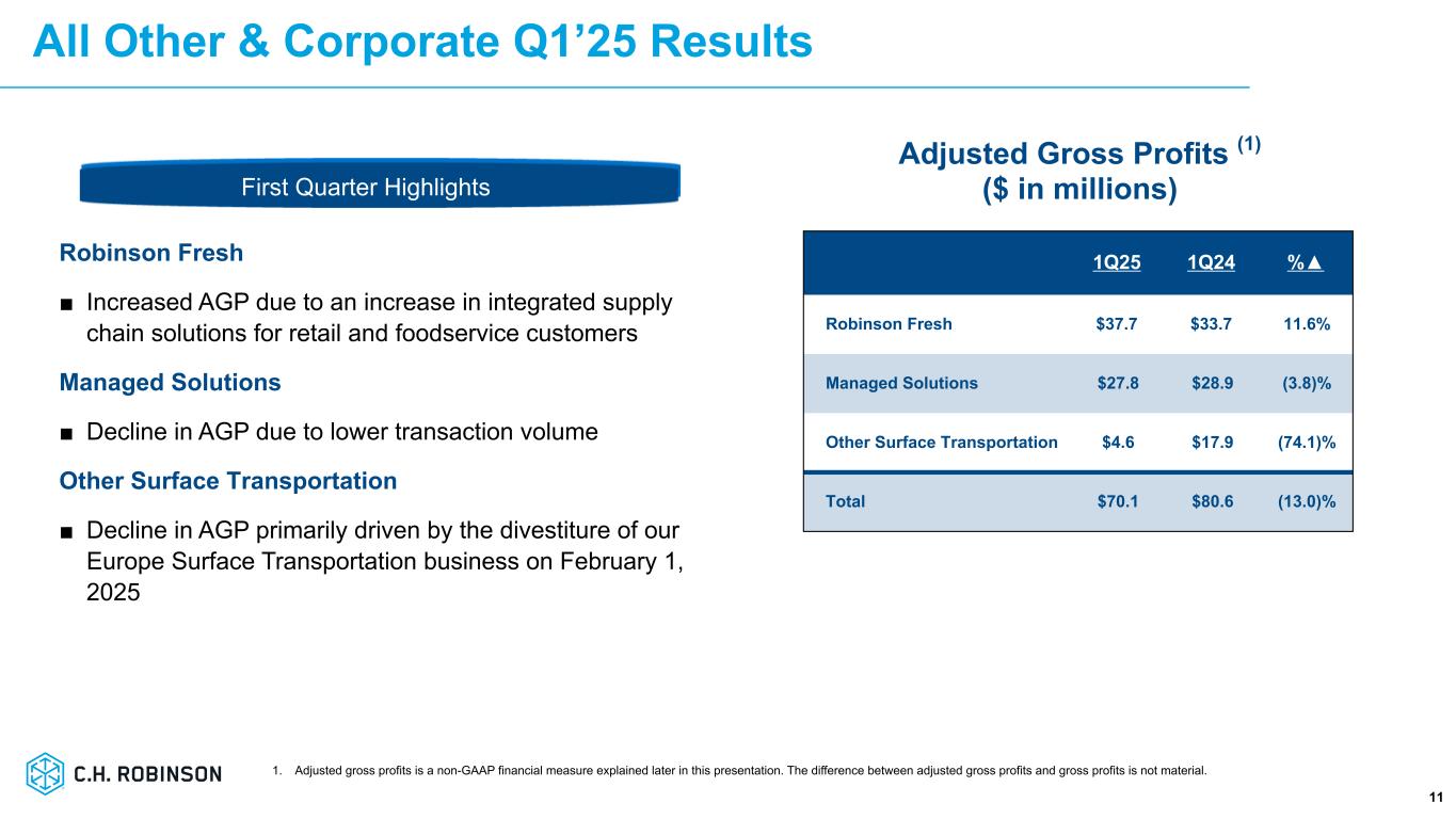 Global Forwarding Q1’25 Results by Service 10 1Q25 1Q24 %▲ Ocean $115.3 $112.9 2.2% Air $32.3 $30.2 7.1% Customs $26.9 $26.1 3.2% Other $10.1 $10.8 (7.5)% Total Adjusted Gross Profits $184.6 $180.0 2.5% Adjusted Gross Profit Margin % 23.8% 21.0% 280 bps Adjusted Gross Profits (1) ($ in millions) ■ Ongoing conflict in the Red Sea continued to cause vessel re-routing, which is putting a strain on ocean capacity and buoying rates ■ Ocean AGP increased due to a 1.5% increase in shipments and a 1.0% increase in AGP per shipment(2) ■ Air AGP increased due to an 11.0% increase in AGP per metric ton shipped, partially offset by a 3.0% decline in metric tons shipped(2) ■ Customs AGP increased due to a 1.5% increase in volume and a 1.5% increase in adjusted gross profit per transaction(2) 1. Adjusted gross profits and adjusted gross profit margin % are non-GAAP financial measures explained later in this presentation. The difference between adjusted gross profits and gross profits is not material. 2. Growth rates are rounded to the nearest 0.5 percent. First Quarter Highlights