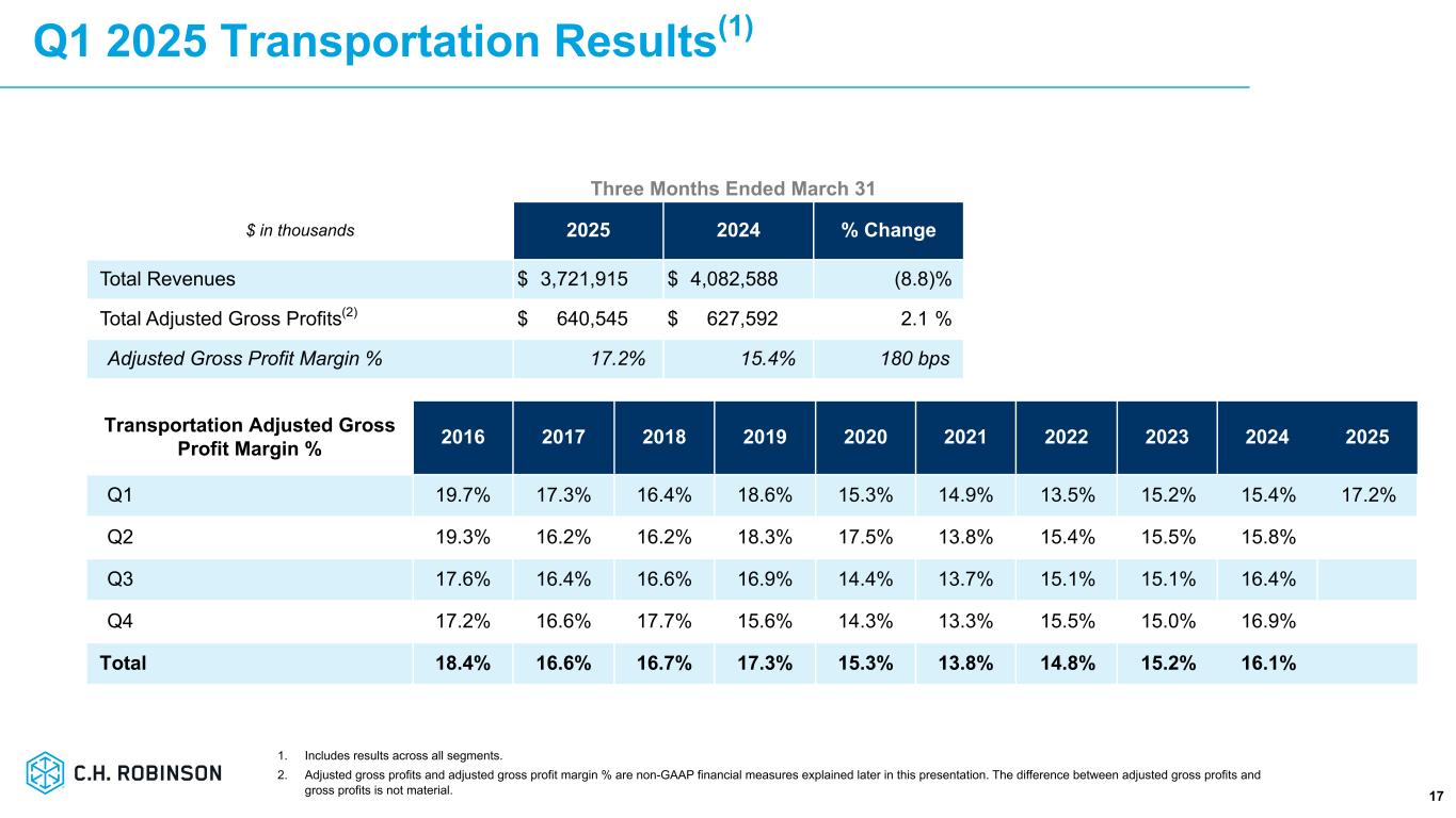 21 Our adjusted gross profit and adjusted gross profit margin are non-GAAP financial measures. Adjusted gross profit is calculated as gross profit excluding amortization of internally developed software utilized to directly serve our customers and contracted carriers. Adjusted gross profit margin is calculated as adjusted gross profit divided by total revenues. We believe adjusted gross profit and adjusted gross profit margin are useful measures of our ability to source, add value, and sell services and products that are provided by third parties, and we consider adjusted gross profit to be a primary performance measurement. The reconciliation of gross profit to adjusted gross profit and gross profit margin to adjusted gross profit margin are presented below: Three Months Ended March 31, $ in thousands 2025 2024 Revenues: Transportation $ 3,721,915 $ 4,082,588 Sourcing 324,825 329,723 Total Revenues $ 4,046,740 $ 4,412,311 Costs and expenses: Purchased transportation and related services 3,081,370 3,454,996 Purchased produced sourced for resale 292,282 299,586 Direct internally developed software amortization 15,666 10,222 Total direct costs $ 3,389,318 $ 3,764,804 Gross profit & Gross profit margin $ 657,422 16.2% $ 647,507 14.7% Plus: Direct internally developed software amortization 15,666 10,222 Adjusted gross profit/Adjusted gross profit margin $ 673,088 16.6% $ 657,729 14.9% Non-GAAP Reconciliations
