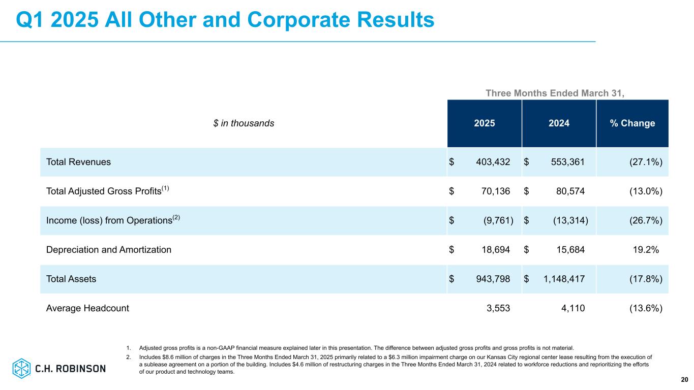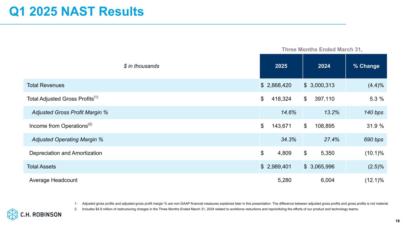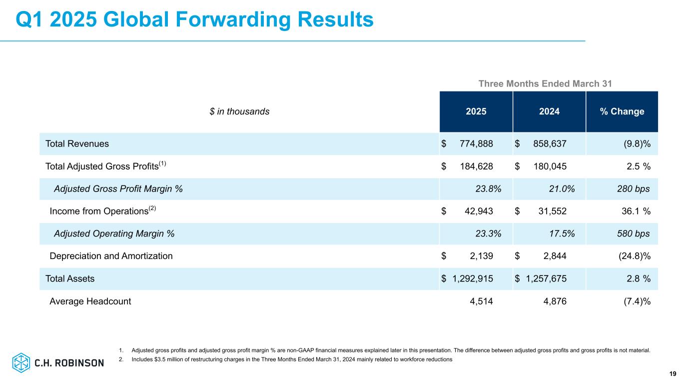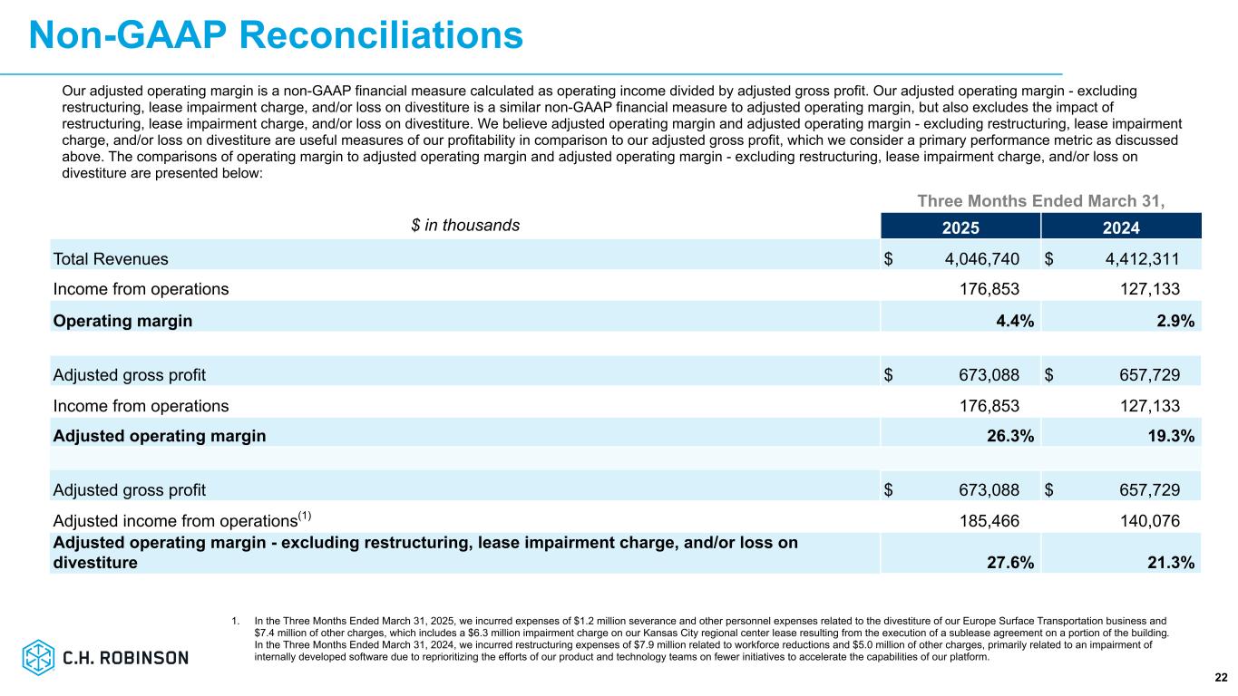 Non-GAAP Reconciliations 22 Our adjusted operating margin is a non-GAAP financial measure calculated as operating income divided by adjusted gross profit. Our adjusted operating margin - excluding restructuring, lease impairment charge, and/or loss on divestiture is a similar non-GAAP financial measure to adjusted operating margin, but also excludes the impact of restructuring, lease impairment charge, and/or loss on divestiture. We believe adjusted operating margin and adjusted operating margin - excluding restructuring, lease impairment charge, and/or loss on divestiture are useful measures of our profitability in comparison to our adjusted gross profit, which we consider a primary performance metric as discussed above. The comparisons of operating margin to adjusted operating margin and adjusted operating margin - excluding restructuring, lease impairment charge, and/or loss on divestiture are presented below: Three Months Ended March 31, $ in thousands 2025 2024 Total Revenues $ 4,046,740 $ 4,412,311 Income from operations 176,853 127,133 Operating margin 4.4% 2.9% Adjusted gross profit $ 673,088 $ 657,729 Income from operations 176,853 127,133 Adjusted operating margin 26.3% 19.3% Adjusted gross profit $ 673,088 $ 657,729 Adjusted income from operations(1) 185,466 140,076 Adjusted operating margin - excluding restructuring, lease impairment charge, and/or loss on divestiture 27.6% 21.3% 1. In the Three Months Ended March 31, 2025, we incurred expenses of $1.2 million severance and other personnel expenses related to the divestiture of our Europe Surface Transportation business and $7.4 million of other charges, which includes a $6.3 million impairment charge on our Kansas City regional center lease resulting from the execution of a sublease agreement on a portion of the building. In the Three Months Ended March 31, 2024, we incurred restructuring expenses of $7.9 million related to workforce reductions and $5.0 million of other charges, primarily related to an impairment of internally developed software due to reprioritizing the efforts of our product and technology teams on fewer initiatives to accelerate the capabilities of our platform.