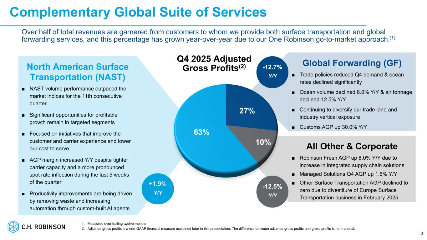 Q4 Highlights 4 ■ North American Surface Transportation (NAST) gained market share in truckload and LTL and expanded gross margins Y/Y through disciplined pricing and a cost of hire advantage ■ Global Forwarding (GF) improved its portfolio yield and expanded gross margins through disciplined pricing and revenue management practices ■ NAST & GF productivity continued to improve Y/Y and drove adjusted operating margin - excluding restructuring(1) to 36.4% in NAST and 25.6% in Global Forwarding ■ Focused on providing best-in-class service to our customers and carriers, gaining profitable share in targeted market segments, streamlining our processes, applying Lean principles and leveraging evolving AI technology to drive out waste and optimize our costs, with a disciplined operating model that arms our people with innovative tools, decouples headcount growth from volume growth and drives operating leverage $3.9B Total Revenues -6.5% Y/Y $657M Adj. Gross Profits(1) -4.0% Y/Y $181M Income from Operations -1.3% Y/Y $1.12 Net Income/Share -8.2% Y/Y Q4 2025 1. Adjusted gross profits, adjusted income from operations, adjusted operating margin - excluding restructuring and adjusted net income per share are non-GAAP financial measures. Refer to pages 24 through 27 for further discussion and a GAAP to Non-GAAP reconciliation. $197M of Adj. Income from Operations(1) +7.1% Y/Y $1.23 of Adj. Net Income per Share(1) +1.7% Y/Y