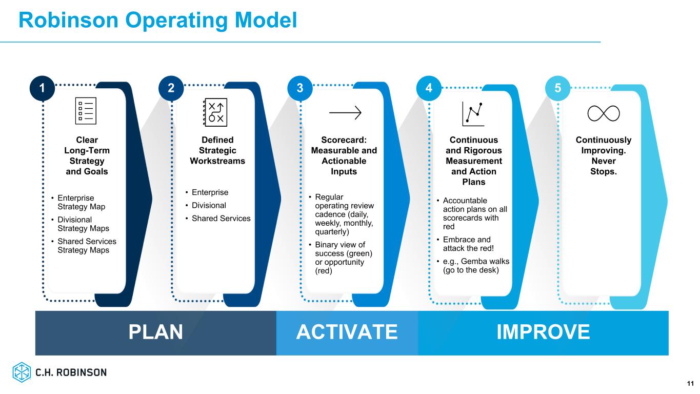 All Other & Corporate Q4’25 Results 10 Robinson Fresh ■ Growth in AGP due to an increase in integrated supply chain solutions for foodservice customers Managed Solutions ■ Total freight under management of $2.0B in Q4 Other Surface Transportation ■ Decline in AGP driven by the divestiture of our Europe Surface Transportation business on February 1, 2025 4Q25 4Q24 %▲ Robinson Fresh $38.9 $36.0 8.0% Managed Solutions $28.6 $28.1 1.6% Other Surface Transportation $— $12.9 (100.0)% Total $67.4 $77.1 (12.5)% Adjusted Gross Profits (1) ($ in millions) 1. Adjusted gross profits is a non-GAAP financial measure explained later in this presentation. The difference between adjusted gross profits and gross profits is not material. Fourth Quarter Highlights