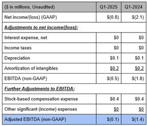 | ● | Adjusted EBITDA. Q1-2025 Adjusted EBITDA was ($108K) vs ($1,409K) YoY, a significant improvement of 92% resulting from both revenue growth and cost management initiatives. |