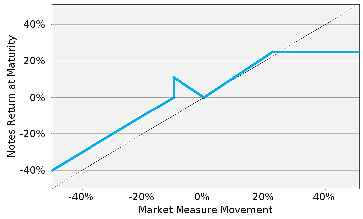 The graph above and the table below reflect the hypothetical return on the notes, based on the terms contained in the table to the left (using the mid-point for any range(s)). The graph and the table have been prepared for purposes of illustration only and do not take into account any tax consequences from investing in the notes. Hypothetical Percentage Change from the Starting Value to the Ending Value Hypothetical Redemption Amount per Unit(1) Hypothetical Total Rate of Return on the Notes -100.00% $1.000 -90.00% -50.00% $6.000 -40.00% -30.00% $8.000 -20.00% -20.00% $9.000 -10.00% -10.00%(2) $11.000 10.00%(3) -5.00% $10.500 5.00% -3.00% $10.300 3.00% 0.00% $10.000 0.00% 5.00% $10.555 5.55% 10.00% $11.110 11.10% 22.53% $12.500 25.00%(4) 40.00% $12.500 25.00% 60.00% $12.500 25.00% 80.00% $12.500 25.00% 100.00% $12.500 25.00% (1) The Redemption Amount per unit is based on the hypothetical Participation Rate of 111.00%. (2) This hypothetical percentage change corresponds to the Threshold Value. (3) Any positive return based on the depreciation of the Market Measure cannot exceed the return provided by the Threshold Value. (4) Any positive return based on the appreciation of the Market Measure cannot exceed the return represented by the Capped Value. |