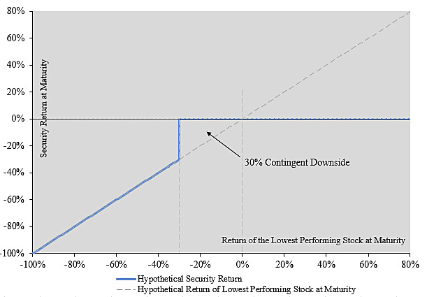 Since the hypothetical Ending Price of the Lowest Performing Stock on the Final Calculation Day is greater than its hypothetical Downside Threshold Price, the Maturity Payment Amount would equal the face amount. Although the hypothetical Ending Price of the Lowest Performing Stock on the Final Calculation Day is significantly greater than its hypothetical Starting Price in this scenario, the Maturity Payment Amount will not exceed the face amount.