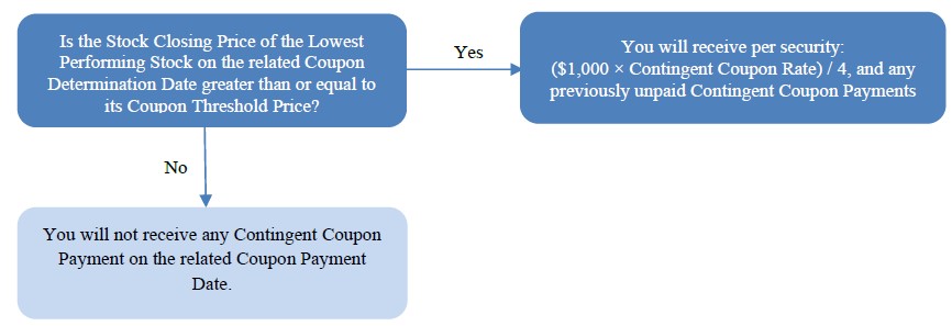 On each Coupon Payment Date, unless the securities have been automatically called, you will receive a Contingent Coupon Payment at a per annum rate equal to the Contingent Coupon Rate (each a “Contingent Coupon Payment”) if, and only if, the Stock Closing Price of the Lowest Performing Stock on the related Coupon Determination Date is greater than or equal to its Coupon Threshold Price. In addition, if the Stock Closing Price of the Lowest Performing Stock on one or more Coupon Determination Dates is less than its Coupon Threshold Price and, on a subsequent Coupon Determination Date, the Stock Closing Price of the Lowest Performing Stock on that subsequent Coupon Determination Date is greater than or equal to its Coupon Threshold Price, on the Coupon Payment Date related to that subsequent Coupon Determination Date, you will receive the Contingent Coupon Payment due for that subsequent Coupon Determination Date plus all previously unpaid Contingent Coupon Payments (without interest on amounts previously unpaid). Each Contingent Coupon Payment, if any, will be calculated per security as follows: ($1,000× Contingent Coupon Rate)/4. Any Contingent Coupon Payment will be rounded to the nearest cent, with one-half cent rounded upward. If the Stock Closing Price of the Lowest Performing Stock on any Coupon Determination Date is less than its Coupon Threshold Price, you will not receive any Contingent Coupon Payment on the related Coupon Payment Date. If the Stock Closing Price of the Lowest Performing Stock on a Coupon Determination Date is less than its Coupon Threshold Price and the Stock Closing Price of the Lowest Performing Stock on each subsequent Coupon Determination Date up to and including the Final Calculation Day is less than its Coupon Threshold Price, you will not receive any unpaid Contingent Coupon Payments in respect of any of those Coupon Determination Dates. In addition, if the Stock Closing Price of the Lowest Performing Stock is less than its Coupon Threshold Price on all Coupon Determination Dates, you will not receive any Contingent Coupon Payments over the term of the securities. |