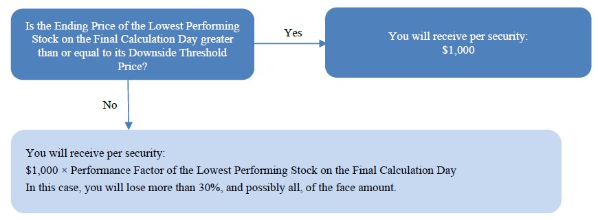 If the securities are not automatically called prior to maturity, you will be entitled to receive at maturity a cash payment per security in U.S. dollars equal to the Maturity Payment Amount (in addition to the final Contingent Coupon Payment and any previously unpaid Contingent Coupon Payments, if otherwise payable). The “Maturity Payment Amount” per security will equal: •if the Ending Price of the Lowest Performing Stock on the Final Calculation Day is greater than or equal to its Downside Threshold Price: $1,000; or •if the Ending Price of the Lowest Performing Stock on the Final Calculation Day is less than its Downside Threshold Price: