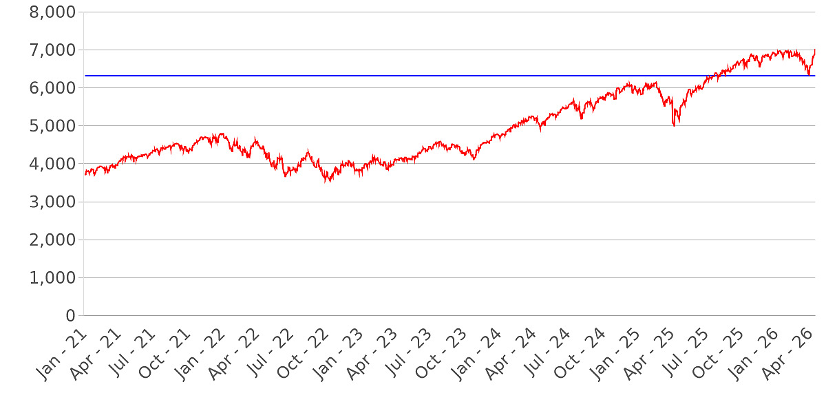 The graph below illustrates the performance of the Underlying from January 1, 2021 to April 15, 2026, based on the daily Closing Levels as reported by Bloomberg L.P. (“Bloomberg”), without independent verification. We have not conducted any independent review or due diligence of the publicly available information from Bloomberg. On April 15, 2026, the Closing Level of the Underlying was 7,022.95 (the “Hypothetical Initial Level”). The blue line indicates a hypothetical Downside Threshold of 6,320.66, which is equal to 90.00% of the Hypothetical Initial Level. The historical performance of the Underlying should not be taken as an indication of its future performance, and no assurances can be given as to the level of the Underlying at any time during the term of the Notes, including the Final Valuation Date. We cannot give you assurance that the performance of the Underlying will result in the return of any of your investment.