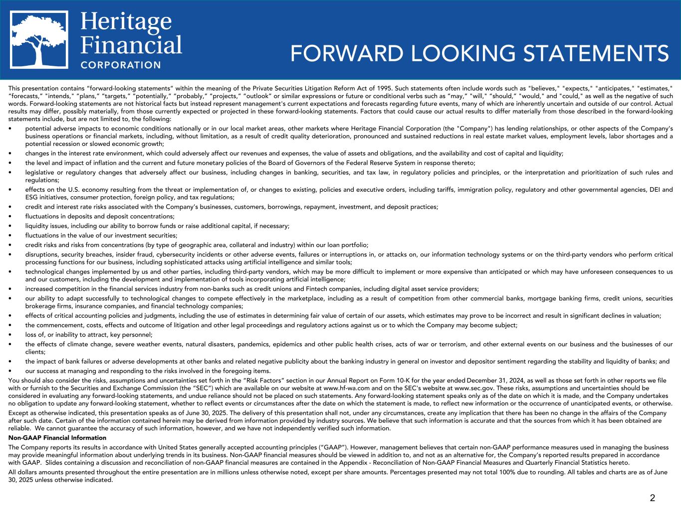 2 This presentation contains “forward-looking statements” within the meaning of the Private Securities Litigation Reform Act of 1995. Such statements often include words such as "believes," "expects," "anticipates," "estimates," “forecasts,” "intends," “plans,” “targets,” “potentially,” “probably,” “projects,” “outlook” or similar expressions or future or conditional verbs such as “may,” "will," “should,” "would," and "could," as well as the negative of such words. Forward-looking statements are not historical facts but instead represent management's current expectations and forecasts regarding future events, many of which are inherently uncertain and outside of our control. Actual results may differ, possibly materially, from those currently expected or projected in these forward-looking statements. Factors that could cause our actual results to differ materially from those described in the forward-looking statements include, but are not limited to, the following: • potential adverse impacts to economic conditions nationally or in our local market areas, other markets where Heritage Financial Corporation (the "Company") has lending relationships, or other aspects of the Company’s business operations or financial markets, including, without limitation, as a result of credit quality deterioration, pronounced and sustained reductions in real estate market values, employment levels, labor shortages and a potential recession or slowed economic growth; • changes in the interest rate environment, which could adversely affect our revenues and expenses, the value of assets and obligations, and the availability and cost of capital and liquidity; • the level and impact of inflation and the current and future monetary policies of the Board of Governors of the Federal Reserve System in response thereto; • legislative or regulatory changes that adversely affect our business, including changes in banking, securities, and tax law, in regulatory policies and principles, or the interpretation and prioritization of such rules and regulations; • effects on the U.S. economy resulting from the threat or implementation of, or changes to existing, policies and executive orders, including tariffs, immigration policy, regulatory and other governmental agencies, DEI and ESG initiatives, consumer protection, foreign policy, and tax regulations; • credit and interest rate risks associated with the Company’s businesses, customers, borrowings, repayment, investment, and deposit practices; • fluctuations in deposits and deposit concentrations; • liquidity issues, including our ability to borrow funds or raise additional capital, if necessary; • fluctuations in the value of our investment securities; • credit risks and risks from concentrations (by type of geographic area, collateral and industry) within our loan portfolio; • disruptions, security breaches, insider fraud, cybersecurity incidents or other adverse events, failures or interruptions in, or attacks on, our information technology systems or on the third-party vendors who perform critical processing functions for our business, including sophisticated attacks using artificial intelligence and similar tools; • technological changes implemented by us and other parties, including third-party vendors, which may be more difficult to implement or more expensive than anticipated or which may have unforeseen consequences to us and our customers, including the development and implementation of tools incorporating artificial intelligence; • increased competition in the financial services industry from non-banks such as credit unions and Fintech companies, including digital asset service providers; • our ability to adapt successfully to technological changes to compete effectively in the marketplace, including as a result of competition from other commercial banks, mortgage banking firms, credit unions, securities brokerage firms, insurance companies, and financial technology companies; • effects of critical accounting policies and judgments, including the use of estimates in determining fair value of certain of our assets, which estimates may prove to be incorrect and result in significant declines in valuation; • the commencement, costs, effects and outcome of litigation and other legal proceedings and regulatory actions against us or to which the Company may become subject; • loss of, or inability to attract, key personnel; • the effects of climate change, severe weather events, natural disasters, pandemics, epidemics and other public health crises, acts of war or terrorism, and other external events on our business and the businesses of our clients; • the impact of bank failures or adverse developments at other banks and related negative publicity about the banking industry in general on investor and depositor sentiment regarding the stability and liquidity of banks; and • our success at managing and responding to the risks involved in the foregoing items. You should also consider the risks, assumptions and uncertainties set forth in the “Risk Factors” section in our Annual Report on Form 10-K for the year ended December 31, 2024, as well as those set forth in other reports we file with or furnish to the Securities and Exchange Commission (the “SEC”) which are available on our website at www.hf-wa.com and on the SEC's website at www.sec.gov. These risks, assumptions and uncertainties should be considered in evaluating any forward-looking statements, and undue reliance should not be placed on such statements. Any forward-looking statement speaks only as of the date on which it is made, and the Company undertakes no obligation to update any forward-looking statement, whether to reflect events or circumstances after the date on which the statement is made, to reflect new information or the occurrence of unanticipated events, or otherwise. Except as otherwise indicated, this prese