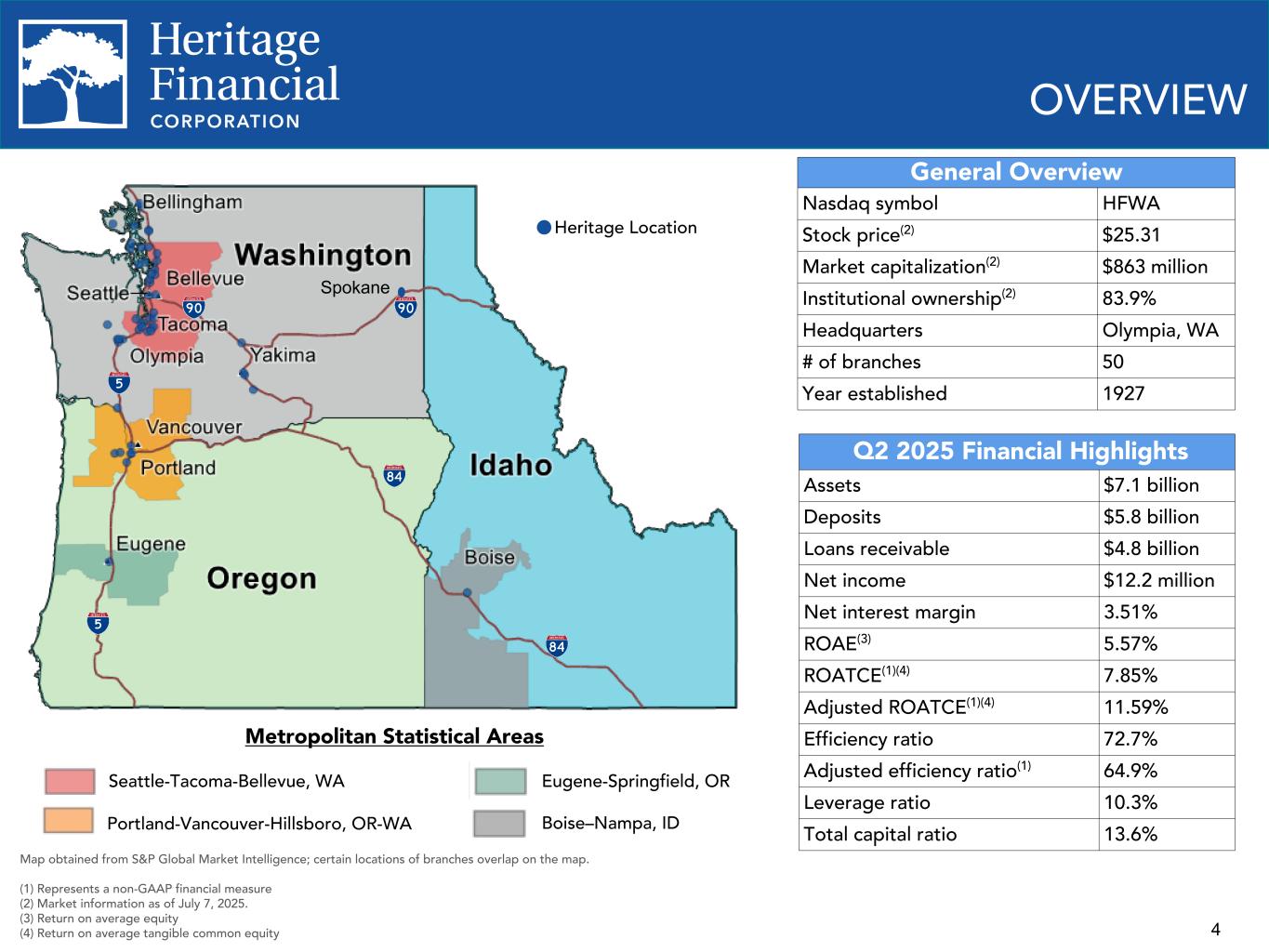 2 This presentation contains “forward-looking statements” within the meaning of the Private Securities Litigation Reform Act of 1995. Such statements often include words such as "believes," "expects," "anticipates," "estimates," “forecasts,” "intends," “plans,” “targets,” “potentially,” “probably,” “projects,” “outlook” or similar expressions or future or conditional verbs such as “may,” "will," “should,” "would," and "could," as well as the negative of such words. Forward-looking statements are not historical facts but instead represent management's current expectations and forecasts regarding future events, many of which are inherently uncertain and outside of our control. Actual results may differ, possibly materially, from those currently expected or projected in these forward-looking statements. Factors that could cause our actual results to differ materially from those described in the forward-looking statements include, but are not limited to, the following: • potential adverse impacts to economic conditions nationally or in our local market areas, other markets where Heritage Financial Corporation (the "Company") has lending relationships, or other aspects of the Company’s business operations or financial markets, including, without limitation, as a result of credit quality deterioration, pronounced and sustained reductions in real estate market values, employment levels, labor shortages and a potential recession or slowed economic growth; • changes in the interest rate environment, which could adversely affect our revenues and expenses, the value of assets and obligations, and the availability and cost of capital and liquidity; • the level and impact of inflation and the current and future monetary policies of the Board of Governors of the Federal Reserve System in response thereto; • legislative or regulatory changes that adversely affect our business, including changes in banking, securities, and tax law, in regulatory policies and principles, or the interpretation and prioritization of such rules and regulations; • effects on the U.S. economy resulting from the threat or implementation of, or changes to existing, policies and executive orders, including tariffs, immigration policy, regulatory and other governmental agencies, DEI and ESG initiatives, consumer protection, foreign policy, and tax regulations; • credit and interest rate risks associated with the Company’s businesses, customers, borrowings, repayment, investment, and deposit practices; • fluctuations in deposits and deposit concentrations; • liquidity issues, including our ability to borrow funds or raise additional capital, if necessary; • fluctuations in the value of our investment securities; • credit risks and risks from concentrations (by type of geographic area, collateral and industry) within our loan portfolio; • disruptions, security breaches, insider fraud, cybersecurity incidents or other adverse events, failures or interruptions in, or attacks on, our information technology systems or on the third-party vendors who perform critical processing functions for our business, including sophisticated attacks using artificial intelligence and similar tools; • technological changes implemented by us and other parties, including third-party vendors, which may be more difficult to implement or more expensive than anticipated or which may have unforeseen consequences to us and our customers, including the development and implementation of tools incorporating artificial intelligence; • increased competition in the financial services industry from non-banks such as credit unions and Fintech companies, including digital asset service providers; • our ability to adapt successfully to technological changes to compete effectively in the marketplace, including as a result of competition from other commercial banks, mortgage banking firms, credit unions, securities brokerage firms, insurance companies, and financial technology companies; • effects of critical accounting policies and judgments, including the use of estimates in determining fair value of certain of our assets, which estimates may prove to be incorrect and result in significant declines in valuation; • the commencement, costs, effects and outcome of litigation and other legal proceedings and regulatory actions against us or to which the Company may become subject; • loss of, or inability to attract, key personnel; • the effects of climate change, severe weather events, natural disasters, pandemics, epidemics and other public health crises, acts of war or terrorism, and other external events on our business and the businesses of our clients; • the impact of bank failures or adverse developments at other banks and related negative publicity about the banking industry in general on investor and depositor sentiment regarding the stability and liquidity of banks; and • our success at managing and responding to the risks involved in the foregoing items. You should also consider the risks, assumptions and uncertainties set forth in the “Risk Factors” section in our Annual Report on Form 10-K for the year ended December 31, 2024, as well as those set forth in other reports we file with or furnish to the Securities and Exchange Commission (the “SEC”) which are available on our website at www.hf-wa.com and on the SEC's website at www.sec.gov. These risks, assumptions and uncertainties should be considered in evaluating any forward-looking statements, and undue reliance should not be placed on such statements. Any forward-looking statement speaks only as of the date on which it is made, and the Company undertakes no obligation to update any forward-looking statement, whether to reflect events or circumstances after the date on which the statement is made, to reflect new information or the occurrence of unanticipated events, or otherwise. Except as otherwise indicated, this prese