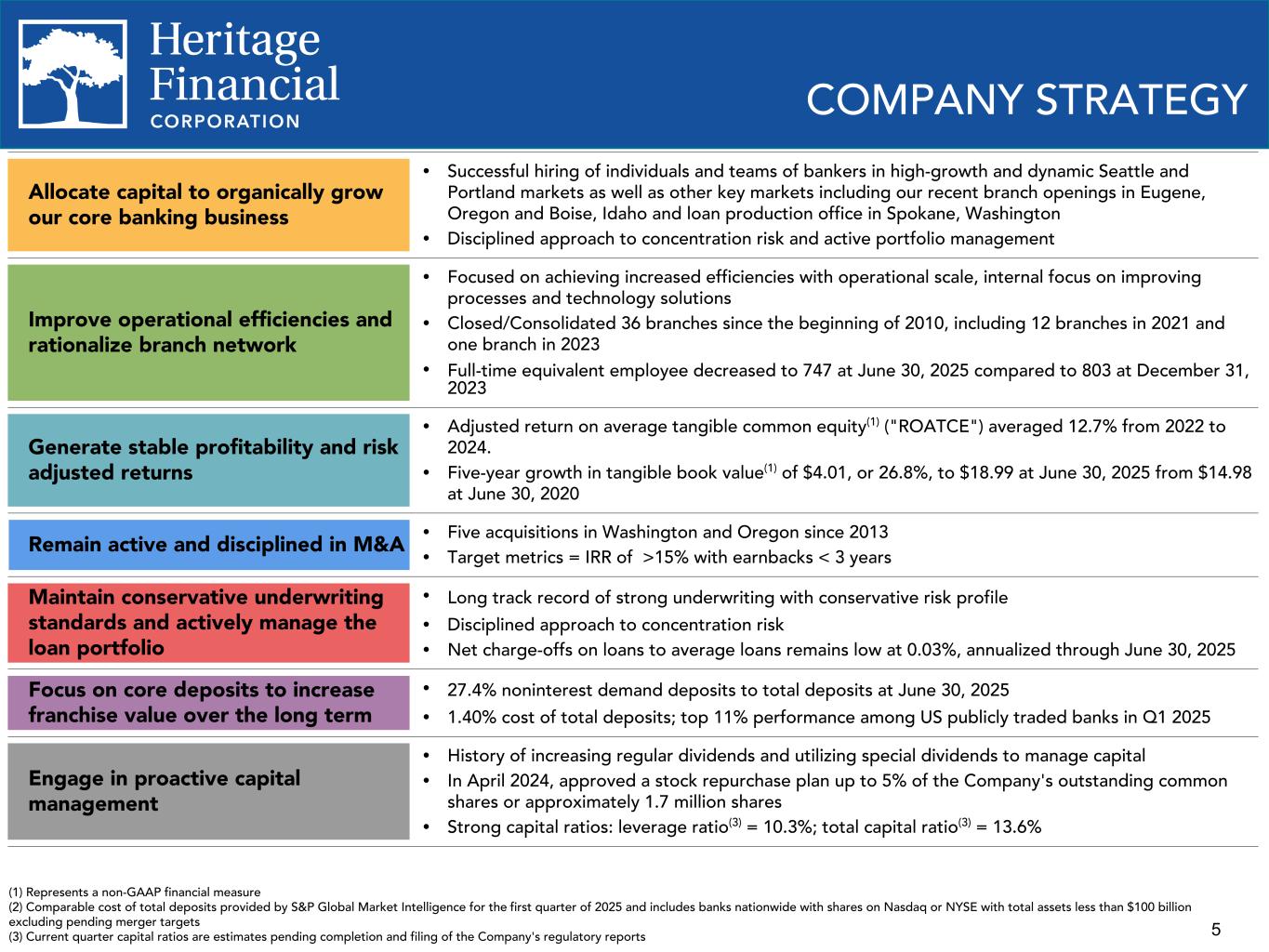 4 OVERVIEW General Overview Nasdaq symbol HFWA Stock price(2) $25.31 Market capitalization(2) $863 million Institutional ownership(2) 83.9% Headquarters Olympia, WA # of branches 50 Year established 1927 Q2 2025 Financial Highlights Assets $7.1 billion Deposits $5.8 billion Loans receivable $4.8 billion Net income $12.2 million Net interest margin 3.51% ROAE(3) 5.57% ROATCE(1)(4) 7.85% Adjusted ROATCE(1)(4) 11.59% Efficiency ratio 72.7% Adjusted efficiency ratio(1) 64.9% Leverage ratio 10.3% Total capital ratio 13.6% Map obtained from S&P Global Market Intelligence; certain locations of branches overlap on the map. (1) Represents a non-GAAP financial measure (2) Market information as of July 7, 2025. (3) Return on average equity (4) Return on average tangible common equity Metropolitan Statistical Areas Seattle-Tacoma-Bellevue, WA Portland-Vancouver-Hillsboro, OR-WA Eugene-Springfield, OR Boise–Nampa, ID Heritage Location Spokane