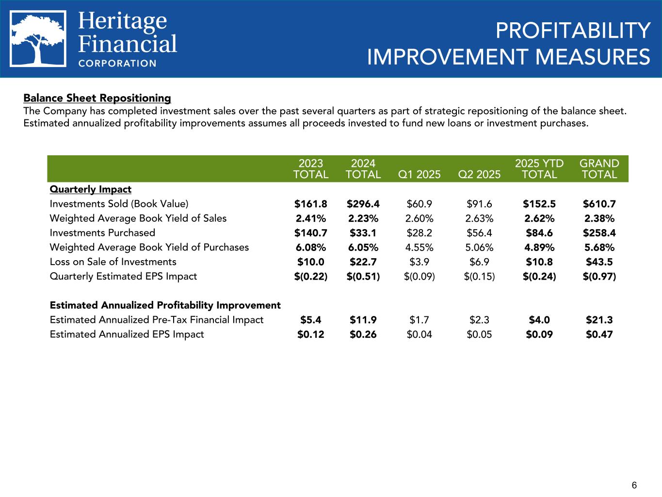 6 PROFITABILITY IMPROVEMENT MEASURES 2023 TOTAL 2024 TOTAL Q1 2025 Q2 2025 2025 YTD TOTAL GRAND TOTAL Quarterly Impact Investments Sold (Book Value) $161.8 $296.4 $60.9 $91.6 $152.5 $610.7 Weighted Average Book Yield of Sales 2.41% 2.23% 2.60% 2.63% 2.62% 2.38% Investments Purchased $140.7 $33.1 $28.2 $56.4 $84.6 $258.4 Weighted Average Book Yield of Purchases 6.08% 6.05% 4.55% 5.06% 4.89% 5.68% Loss on Sale of Investments $10.0 $22.7 $3.9 $6.9 $10.8 $43.5 Quarterly Estimated EPS Impact $(0.22) $(0.51) $(0.09) $(0.15) $(0.24) $(0.97) Estimated Annualized Profitability Improvement Estimated Annualized Pre-Tax Financial Impact $5.4 $11.9 $1.7 $2.3 $4.0 $21.3 Estimated Annualized EPS Impact $0.12 $0.26 $0.04 $0.05 $0.09 $0.47 Balance Sheet Repositioning The Company has completed investment sales over the past several quarters as part of strategic repositioning of the balance sheet. Estimated annualized profitability improvements assumes all proceeds invested to fund new loans or investment purchases.