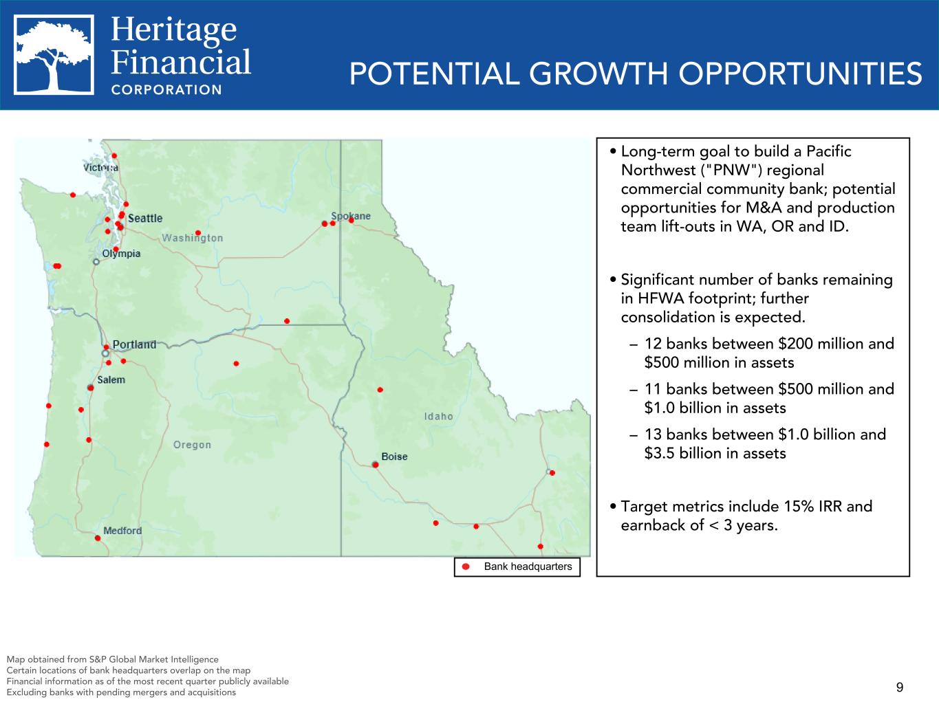 8 LOANS AND DEPOSITS BY LOCATION MSA = Metropolitan or Micropolitan Statistical Area Location based upon branch or office location Loans by MSA Seattle WA $2,319 48.6% Portland OR-WA $728 15.2% Mount Vernon WA $258 5.4% Olympia WA $187 3.9% Yakima WA $102 2.1% Bellingham WA $183 3.8% Eugene OR $80 1.7% Boise ID $80 1.7% Other $838 17.6% Deposits by MSA Seattle WA $2,545 44.0% Portland OR-WA $841 14.6% Mount Vernon WA $332 5.7% Olympia WA $499 8.6% Longview WA $152 2.6% Oak Harbor WA $554 9.6% Yakima WA $226 3.9% Bellingham WA $169 2.9% Other $466 8.1%