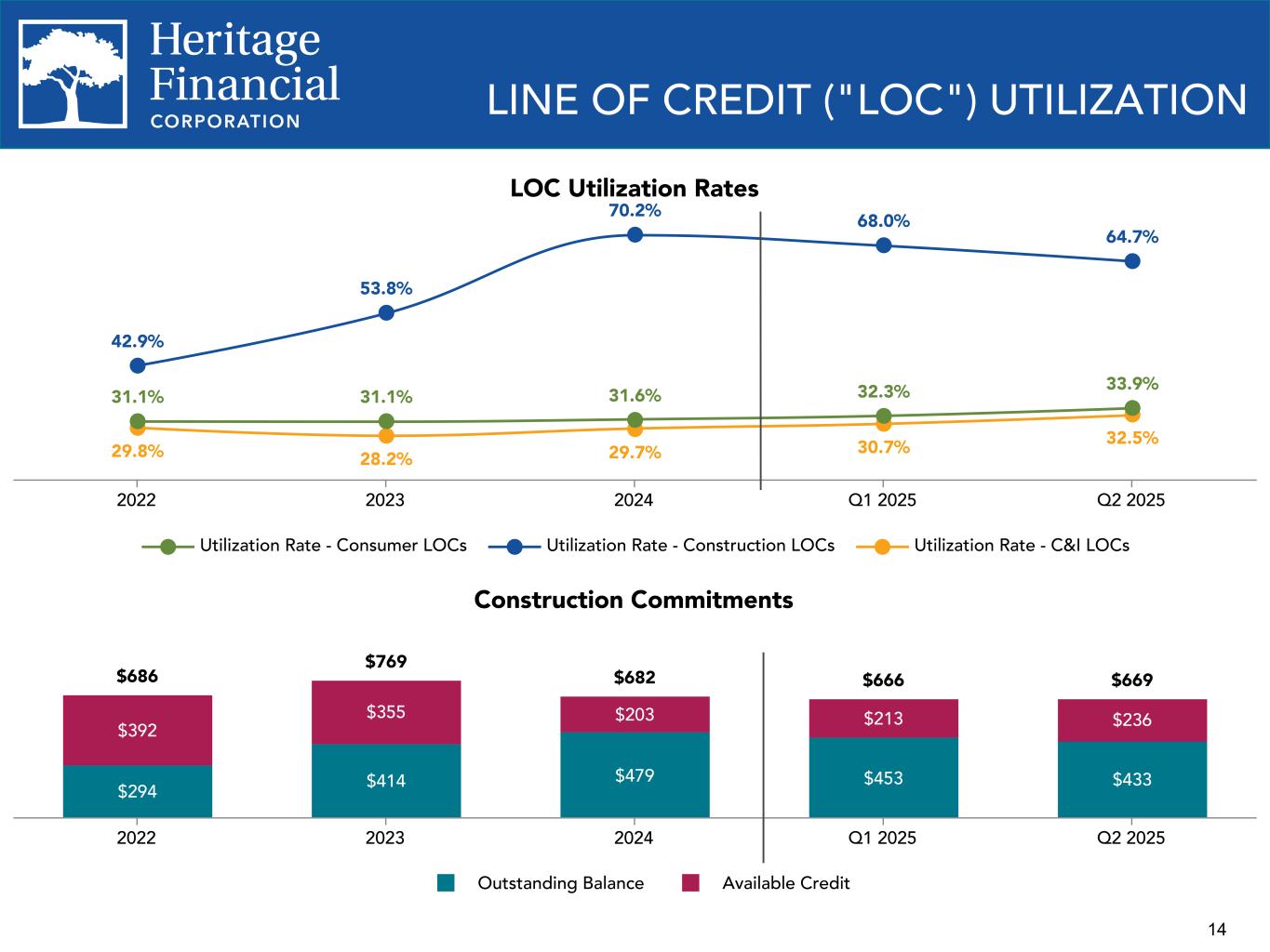13 LOAN PORTFOLIO Loan Portfolio Composition $196 $171 $165 $167 $172 $344 $375 $403 $393 $384$294 $414 $479 $453 $433 $693 $718 $843 $851 $831 $937 $959 $1,003 $985 $1,015 $1,587 $1,698 $1,909 $1,916 $1,940 Consumer Residential real estate Construction & land development Commercial and Industrial (C&I) Owner-occupied CRE Non-owner occupied CRE 2022 2023 2024 Q1 2025 Q2 2025 New Loan Commitments $25 $24 $21 $18 $20$27 $2 $— $— $— $63 $35 $85 $64 $88$87 $128 $101 $59 $49 $68 $90 $130 $60 $111 Consumer Residential real estate Construction & land development Commercial and Industrial (C&I) Commercial Real Estate (CRE) Q2 2024 Q3 2024 Q4 2024 Q1 2025 Q2 2025
