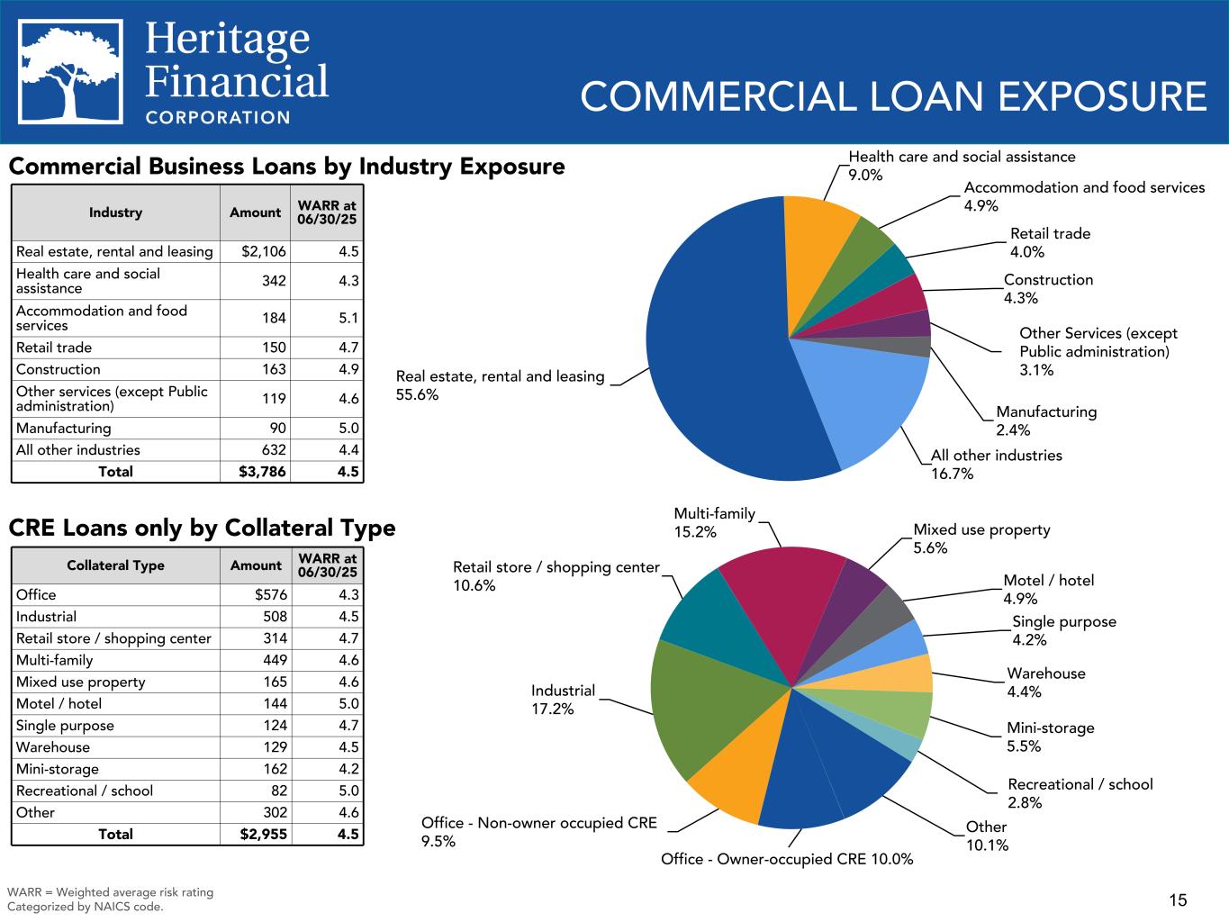 15 COMMERCIAL LOAN EXPOSURE Commercial Business Loans by Industry Exposure Industry Amount WARR at 06/30/25 Real estate, rental and leasing $2,106 4.5 Health care and social assistance 342 4.3 Accommodation and food services 184 5.1 Retail trade 150 4.7 Construction 163 4.9 Other services (except Public administration) 119 4.6 Manufacturing 90 5.0 All other industries 632 4.4 Total $3,786 4.5 CRE Loans only by Collateral Type Collateral Type Amount WARR at 06/30/25 Office $576 4.3 Industrial 508 4.5 Retail store / shopping center 314 4.7 Multi-family 449 4.6 Mixed use property 165 4.6 Motel / hotel 144 5.0 Single purpose 124 4.7 Warehouse 129 4.5 Mini-storage 162 4.2 Recreational / school 82 5.0 Other 302 4.6 Total $2,955 4.5 WARR = Weighted average risk rating Categorized by NAICS code. Office - Owner-occupied CRE 10.0% Office - Non-owner occupied CRE 9.5% Industrial 17.2% Retail store / shopping center 10.6% Multi-family 15.2% Mixed use property 5.6% Motel / hotel 4.9% Single purpose 4.2% Warehouse 4.4% Mini-storage 5.5% Recreational / school 2.8% Other 10.1% Real estate, rental and leasing 55.6% Health care and social assistance 9.0% Accommodation and food services 4.9% Retail trade 4.0% Construction 4.3% Other Services (except Public administration) 3.1% Manufacturing 2.4% All other industries 16.7%