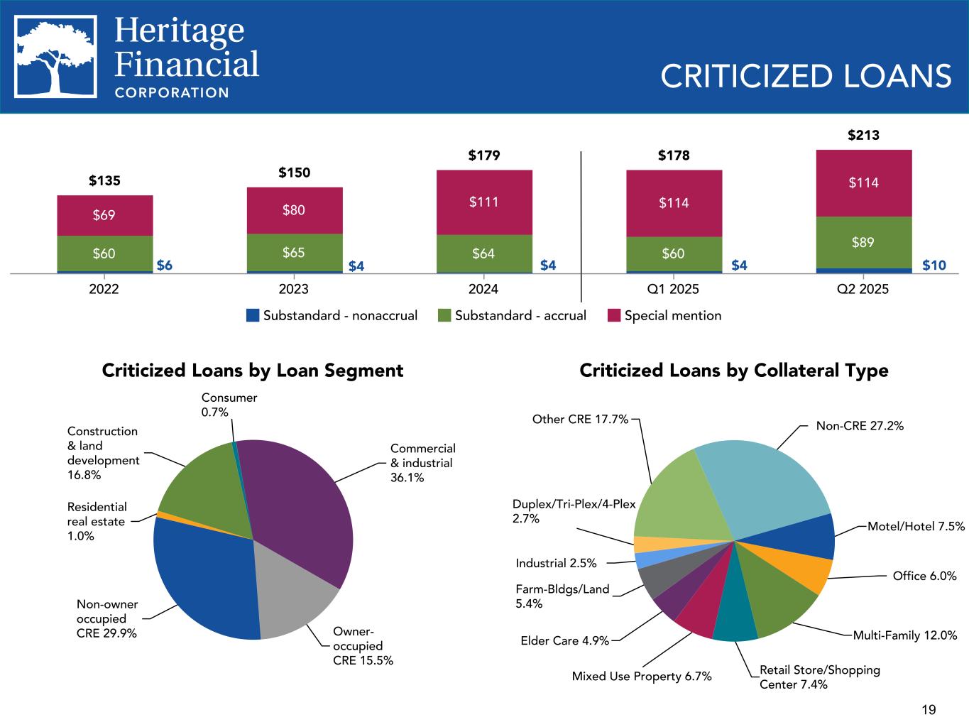 18 Net charge-offs (recoveries) on loans to average loans, annualized (0.03)% (0.01)% 0.06% 0.03% 0.00% 0.22% 0.00% 0.03% 0.04% 2022 2023 2024 2025 YTD Q2 2024 Q3 2024 Q4 2024 Q1 2025 Q2 2025 (0.10)% 0.00% 0.10% 0.20% 0.30% Nonaccrual Loans $6 $4 $4 $4 $10 Nonaccrual loans Nonaccrual loans to loans receivable 2022 2023 2024 Q1 2025 Q2 2025 0.15% 0.10% 0.08% 0.09% 0.21% NONACCRUAL LOANS AND NET CHARGE-OFFS