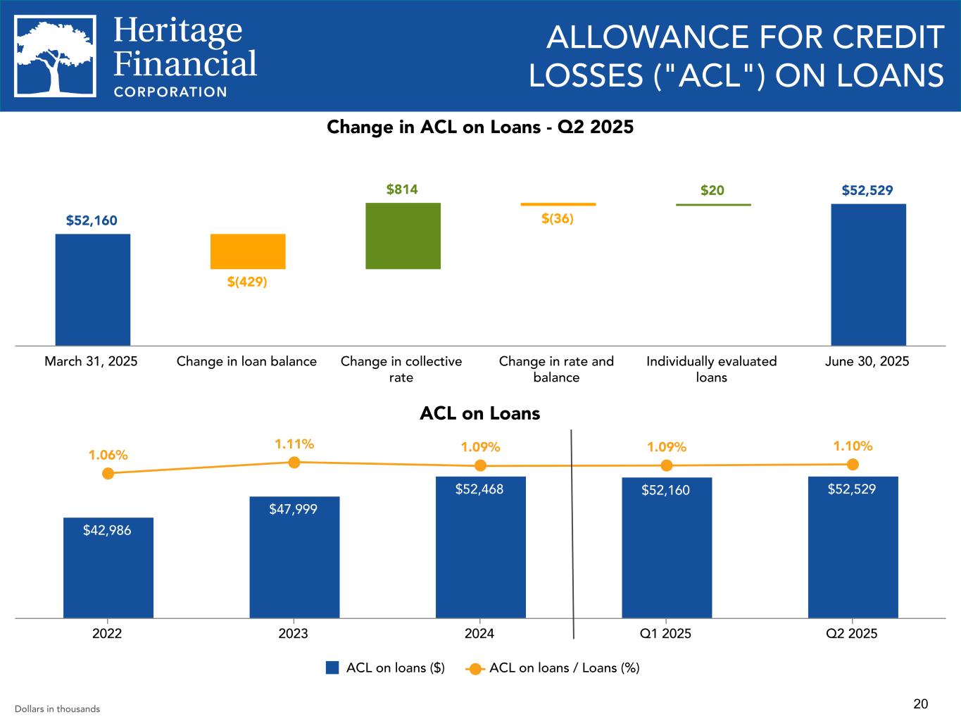 20 ACL on Loans $42,986 $47,999 $52,468 $52,160 $52,529 1.06% 1.11% 1.09% 1.09% 1.10% ACL on loans ($) ACL on loans / Loans (%) 2022 2023 2024 Q1 2025 Q2 2025 ALLOWANCE FOR CREDIT LOSSES ("ACL") ON LOANS $52,160 $(429) $814 $(36) $20 $52,529 March 31, 2025 Change in loan balance Change in collective rate Change in rate and balance Individually evaluated loans June 30, 2025 Change in ACL on Loans - Q2 2025 Dollars in thousands