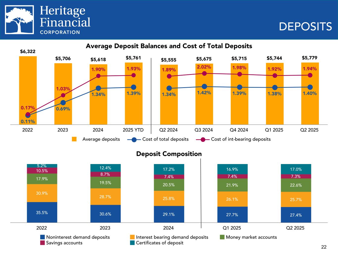 21 CRITICIZED LOANS AND NET CHARGE-OFF HISTORY Criticized Loans to Total Loans 3.63% 3.79% 6.50% 4.81% 3.34% 3.45% 3.73% 3.74% 2.19% 2.05% 3.47% 2.63% 1.96% 2.32% 2.66% 2.82% Heritage Peer Median 2018 2019 2020 2021 2022 2023 2024 Q1 2025 Net Charge-offs to Average Loans 0.06% 0.09% 0.07% 0.01% (0.03)% (0.01)% 0.06% 0.02% 0.07% 0.11% 0.05% 0.03% 0.02% 0.07% 0.05% 0.04% Heritage Peer Median 2018 2019 2020 2021 2022 2023 2024 Q1 2025 (1) Criticized loans includes loans graded special mention or worse (2) Peer Median is the median of 17 identified peer banks and is as of March 31, 2025 Proactive Credit Management • Heritage proactively downgrades loans that are experiencing financial difficulty. • Criticized loans(1) to total loans higher than peer median(2) since 2018 • NCOs recognized during the same period were generally lower than peer median.