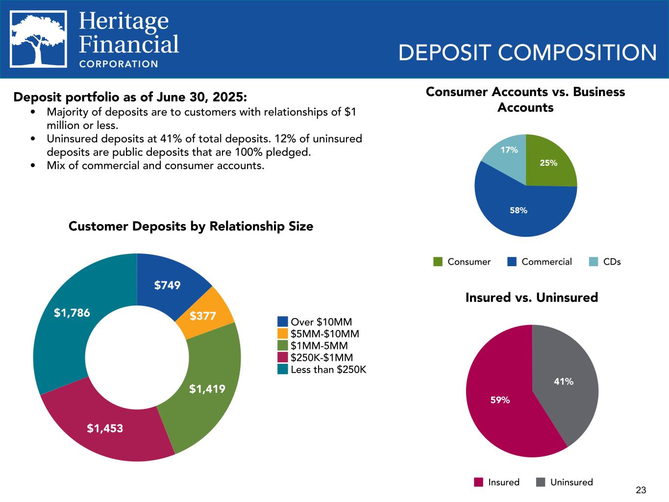 22 Average Deposit Balances and Cost of Total Deposits $6,322 $5,706 $5,618 $5,761 $5,555 $5,675 $5,715 $5,744 $5,779 0.11% 0.69% 1.34% 1.39% 1.34% 1.42% 1.39% 1.38% 1.40% 1.89% 2.02% 1.98% 1.92% 1.94% 0.17% 1.03% 1.90% 1.93% Average deposits Cost of total deposits Cost of int-bearing deposits 2022 2023 2024 2025 YTD Q2 2024 Q3 2024 Q4 2024 Q1 2025 Q2 2025 DEPOSITS Deposit Composition 35.5% 30.6% 29.1% 27.7% 27.4% 30.9% 28.7% 25.8% 26.1% 25.7% 17.9% 19.5% 20.5% 21.9% 22.6% 10.5% 8.7% 7.4% 7.4% 7.3% 5.2% 12.4% 17.2% 16.9% 17.0% Noninterest demand deposits Interest bearing demand deposits Money market accounts Savings accounts Certificates of deposit 2022 2023 2024 Q1 2025 Q2 2025