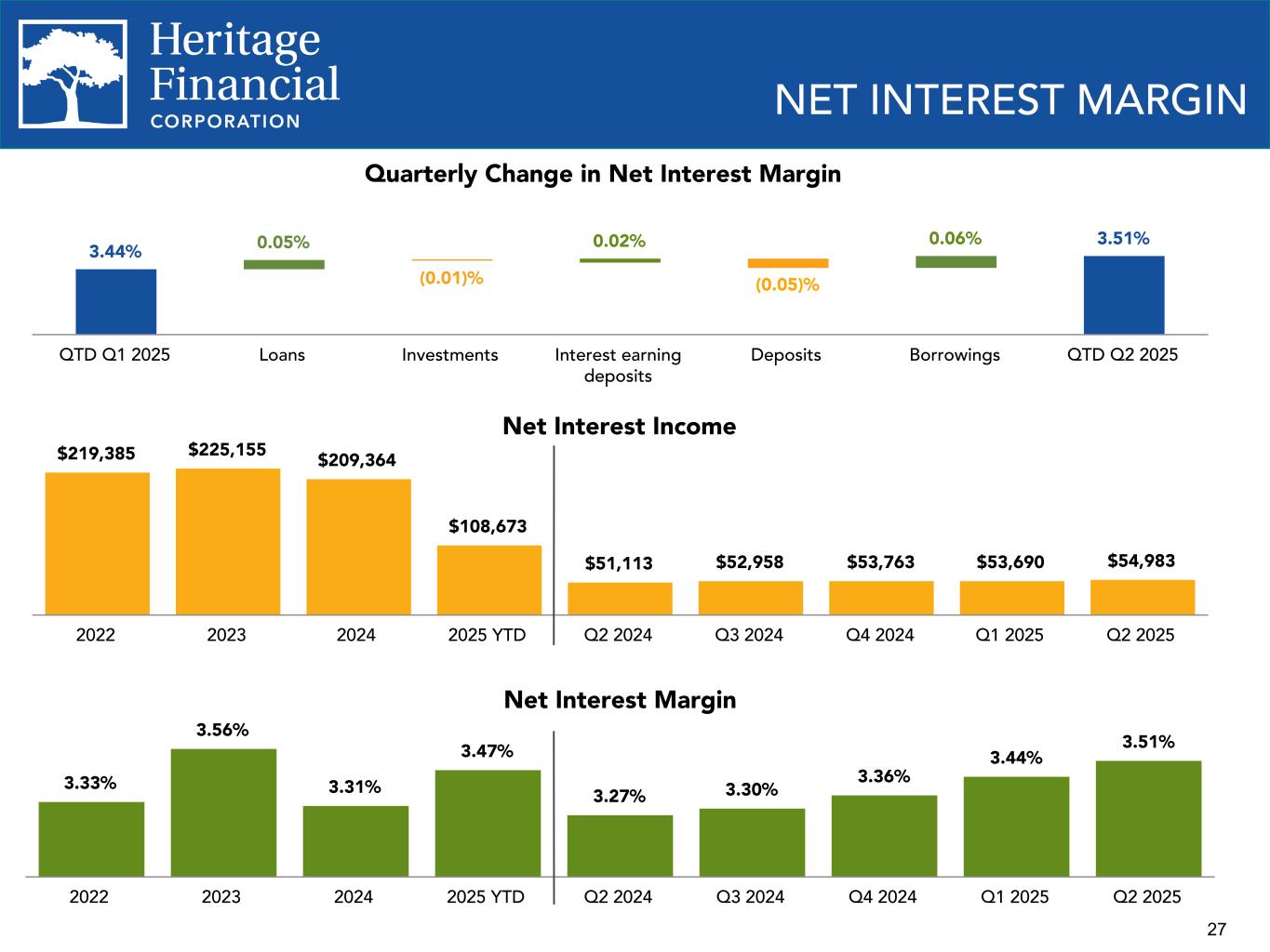 27 Net Interest Margin 3.33% 3.56% 3.31% 3.47% 3.27% 3.30% 3.36% 3.44% 3.51% 2022 2023 2024 2025 YTD Q2 2024 Q3 2024 Q4 2024 Q1 2025 Q2 2025 NET INTEREST MARGIN Quarterly Change in Net Interest Margin 3.44% 0.05% (0.01)% 0.02% (0.05)% 0.06% 3.51% QTD Q1 2025 Loans Investments Interest earning deposits Deposits Borrowings QTD Q2 2025 Net Interest Income $219,385 $225,155 $209,364 $108,673 $51,113 $52,958 $53,763 $53,690 $54,983 2022 2023 2024 2025 YTD Q2 2024 Q3 2024 Q4 2024 Q1 2025 Q2 2025
