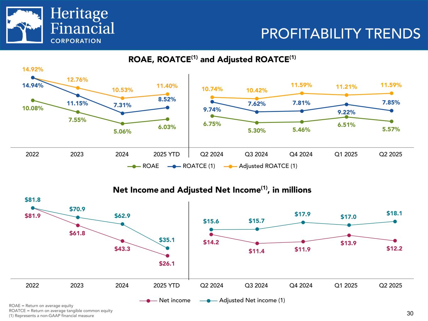 29 PROFITABILITY TRENDS ROAA and Adjusted ROAA(1) 1.12% 0.86% 0.61% 0.74% 0.80% 0.63% 0.66% 0.79% 0.70% 1.12% 0.99% 0.88% 1.00% 0.89% 0.87% 0.99% 0.97% 1.03% ROAA Adjusted ROAA (1) 2022 2023 2024 2025 YTD Q2 2024 Q3 2024 Q4 2024 Q1 2025 Q2 2025 Noninterest Expense/Avg. Assets 2.06% 2.33% 2.22% 2.35% 2.21% 2.18% 2.20% 2.36% 2.34% 2022 2023 2024 2025 YTD Q2 2024 Q3 2024 Q4 2024 Q1 2025 Q2 2025 ROAA = Return on average assets (1) Represents a non-GAAP financial measure