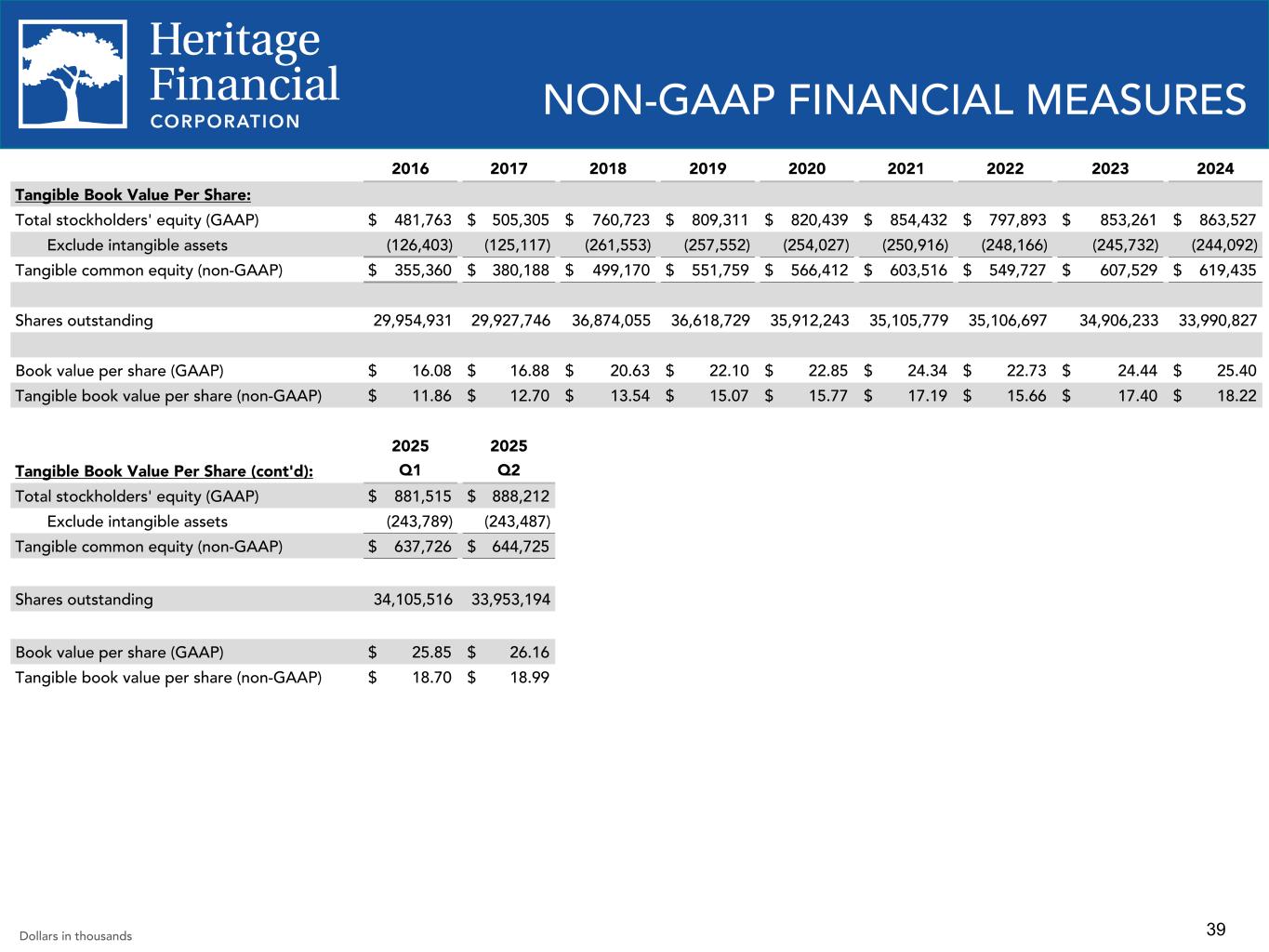 38 NON-GAAP FINANCIAL MEASURES 2022 2023 2024 Q2 2024 Q3 2024 Q4 2024 Q1 2025 Q2 2025 Diluted Earnings per Share and Adjusted Diluted Earnings per Share: Net income (GAAP) $ 81,875 $ 61,755 $ 43,258 $ 14,159 $ 11,423 $ 11,928 $ 13,911 $ 12,215 Exclude (gain) loss on sale of investment securities, net 256 12,231 22,742 1,921 6,945 3,903 3,887 6,854 Exclude gain on sale of branch including related deposits, net — (610) — — — — — — Exclude gain on sale of premise and equipment (403) — (1,552) (49) (1,480) (23) (3) (5) Exclude tax effect of adjustments 31 (2,440) (4,450) (393) (1,148) (815) (816) (1,438) Exclude BOLI restructuring costs included in BOLI Income — — 508 — — 508 — — Exclude tax expense related to BOLI restructuring — — 2,371 — — 2,371 — 515 Adjusted net income (non-GAAP) $ 81,759 $ 70,936 $ 62,877 $ 15,638 $ 15,740 $ 17,872 $ 16,979 $ 18,141 Average number of diluted shares outstanding 35,463,896 35,258,189 34,899,036 34,919,395 34,658,674 34,553,139 34,506,238 34,446,710 Diluted earnings per share (GAAP) $ 2.31 $ 1.75 $ 1.24 $ 0.41 $ 0.33 $ 0.34 $ 0.40 $ 0.36 Adjusted diluted earnings per share (non-GAAP) $ 2.31 $ 2.01 $ 1.80 $ 0.45 $ 0.45 $ 0.51 $ 0.49 $ 0.53 Dollars in thousands