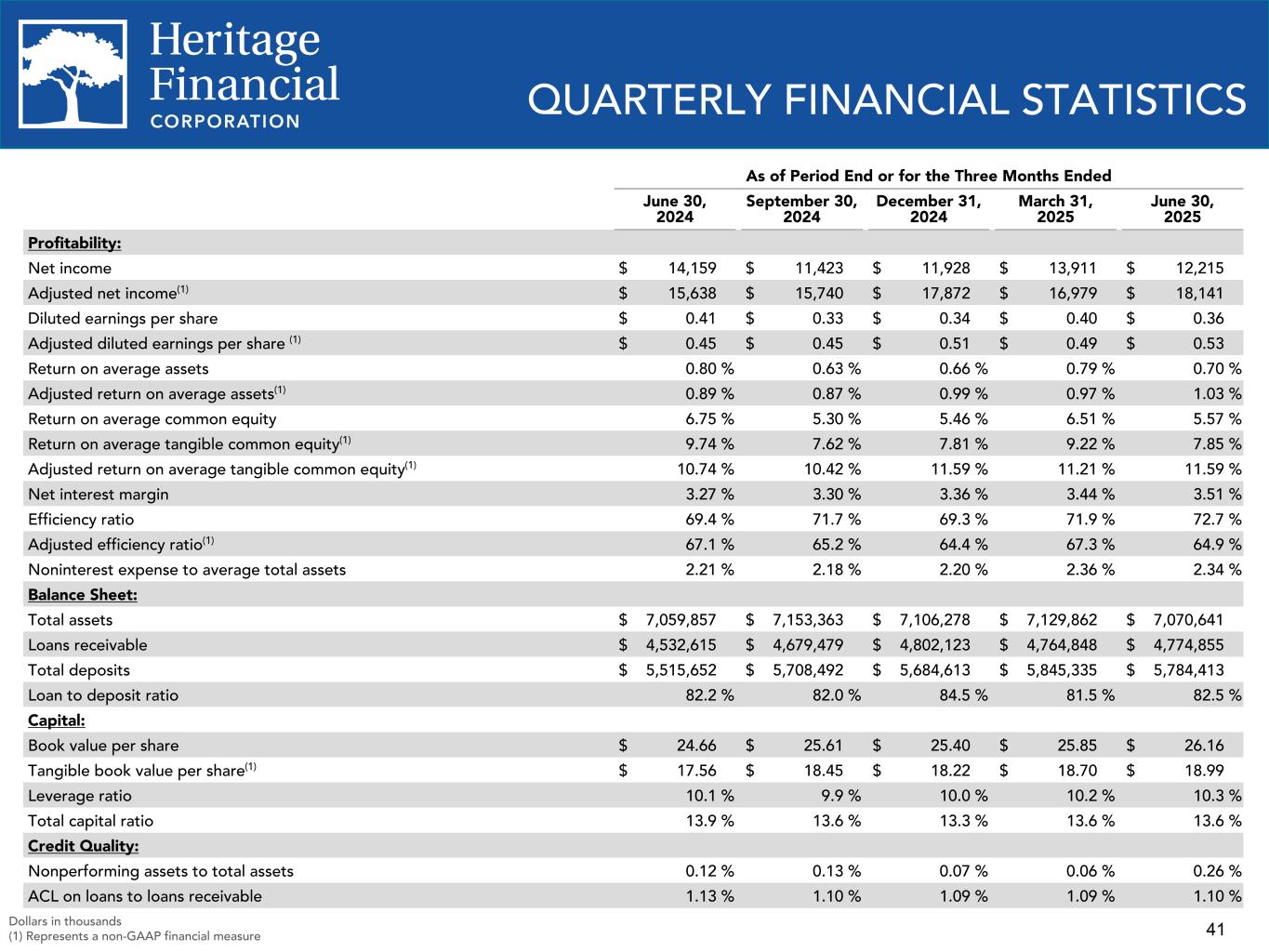 40 NON-GAAP FINANCIAL MEASURES Q2 2024 Q3 2024 Q4 2024 Q1 2025 Q2 2025 Efficiency Ratio and Adjusted Efficiency Ratio Total noninterest expense (GAAP) $ 39,096 $ 39,290 $ 39,540 $ 41,383 $ 41,085 Net interest income (GAAP) $ 51,113 $ 52,958 $ 53,763 $ 53,690 $ 54,983 Total noninterest income (GAAP) $ 5,246 $ 1,837 $ 3,290 $ 3,903 $ 1,517 Exclude (gain) loss on sale of investment securities, net 1,921 6,945 3,903 3,887 6,854 Exclude gain on sale of premise and equipment (49) (1,480) (23) (3) (5) Exclude BOLI restructuring costs included in BOLI Income — — 508 — — Adjusted total non interest income (non-GAAP) $ 7,118 $ 7,302 $ 7,678 $ 7,787 $ 8,366 Efficiency ratio (GAAP) 69.37 % 71.70 % 69.30 % 71.85 % 72.72 % Adjusted efficiency ratio (non-GAAP) 67.14 % 65.20 % 64.35 % 67.31 % 64.86 % Dollars in thousands
