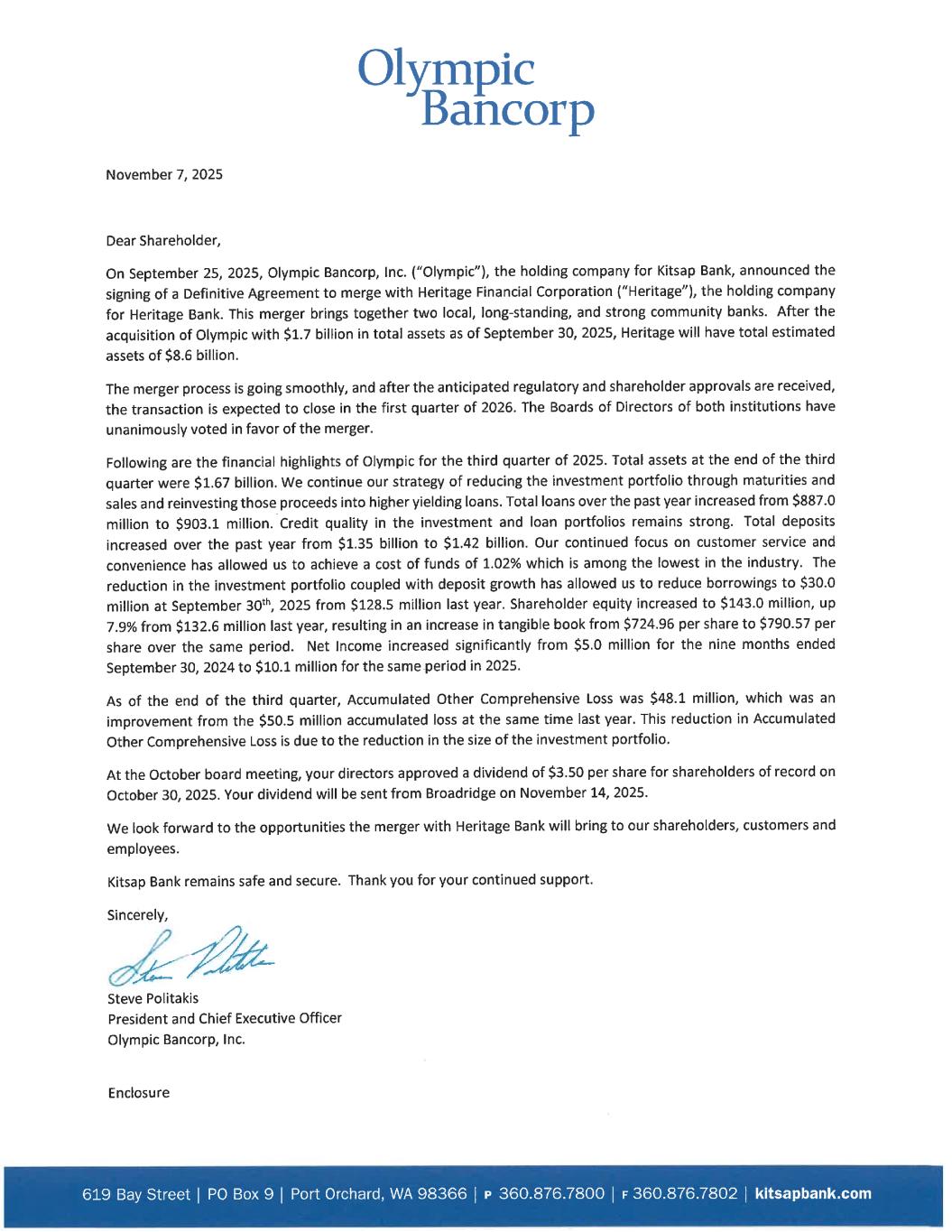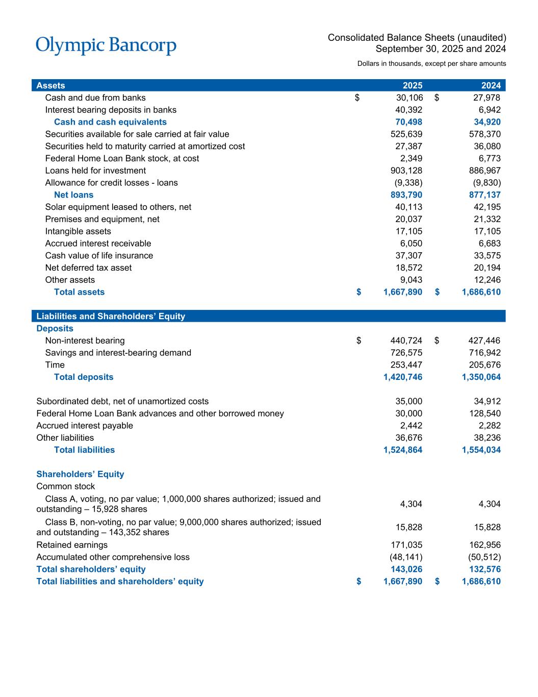 Consolidated Balance Sheets (unaudited) September 30, 2025 and 2024 Dollars in thousands, except per share amounts Assets 2025 2024 Cash and due from banks $ 30,106 $ 27,978 Interest bearing deposits in banks 40,392 6,942 Cash and cash equivalents 70,498 34,920 Securities available for sale carried at fair value 525,639 578,370 Securities held to maturity carried at amortized cost 27,387 36,080 Federal Home Loan Bank stock, at cost 2,349 6,773 Loans held for investment 903,128 886,967 Allowance for credit losses - loans (9,338) (9,830) Net loans 893,790 877,137 Solar equipment leased to others, net 40,113 42,195 Premises and equipment, net 20,037 21,332 Intangible assets 17,105 17,105 Accrued interest receivable 6,050 6,683 Cash value of life insurance 37,307 33,575 Net deferred tax asset 18,572 20,194 Other assets 9,043 12,246 Total assets $ 1,667,890 $ 1,686,610 Liabilities and Shareholders’ Equity Deposits Non-interest bearing $ 440,724 $ 427,446 Savings and interest-bearing demand 726,575 716,942 Time 253,447 205,676 Total deposits 1,420,746 1,350,064 Subordinated debt, net of unamortized costs 35,000 34,912 Federal Home Loan Bank advances and other borrowed money 30,000 128,540 Accrued interest payable 2,442 2,282 Other liabilities 36,676 38,236 Total liabilities 1,524,864 1,554,034 Shareholders’ Equity Common stock Class A, voting, no par value; 1,000,000 shares authorized; issued and outstanding – 15,928 shares 4,304 4,304 Class B, non-voting, no par value; 9,000,000 shares authorized; issued and outstanding – 143,352 shares 15,828 15,828 Retained earnings 171,035 162,956 Accumulated other comprehensive loss (48,141) (50,512) Total shareholders’ equity 143,026 132,576 Total liabilities and shareholders’ equity $ 1,667,890 $ 1,686,610
