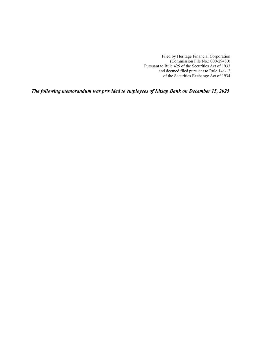 Filed by Heritage Financial Corporation (Commission File No.: 000-29480) Pursuant to Rule 425 of the Securities Act of 1933 and deemed filed pursuant to Rule 14a-12 of the Securities Exchange Act of 1934 The following memorandum was provided to employees of Kitsap Bank on December 15, 2025