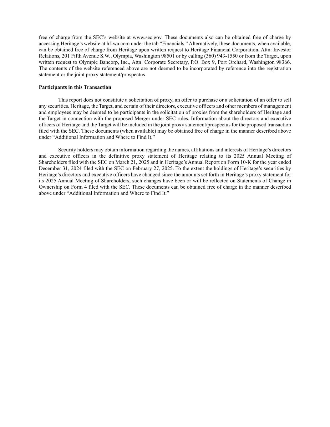 free of charge from the SEC’s website at www.sec.gov. These documents also can be obtained free of charge by accessing Heritage’s website at hf-wa.com under the tab “Financials.” Alternatively, these documents, when available, can be obtained free of charge from Heritage upon written request to Heritage Financial Corporation, Attn: Investor Relations, 201 Fifth Avenue S.W., Olympia, Washington 98501 or by calling (360) 943-1550 or from the Target, upon written request to Olympic Bancorp, Inc., Attn: Corporate Secretary, P.O. Box 9, Port Orchard, Washington 98366. The contents of the website referenced above are not deemed to be incorporated by reference into the registration statement or the joint proxy statement/prospectus. Participants in this Transaction This report does not constitute a solicitation of proxy, an offer to purchase or a solicitation of an offer to sell any securities. Heritage, the Target, and certain of their directors, executive officers and other members of management and employees may be deemed to be participants in the solicitation of proxies from the shareholders of Heritage and the Target in connection with the proposed Merger under SEC rules. Information about the directors and executive officers of Heritage and the Target will be included in the joint proxy statement/prospectus for the proposed transaction filed with the SEC. These documents (when available) may be obtained free of charge in the manner described above under “Additional Information and Where to Find It.” Security holders may obtain information regarding the names, affiliations and interests of Heritage’s directors and executive officers in the definitive proxy statement of Heritage relating to its 2025 Annual Meeting of Shareholders filed with the SEC on March 21, 2025 and in Heritage’s Annual Report on Form 10-K for the year ended December 31, 2024 filed with the SEC on February 27, 2025. To the extent the holdings of Heritage’s securities by Heritage’s directors and executive officers have changed since the amounts set forth in Heritage’s proxy statement for its 2025 Annual Meeting of Shareholders, such changes have been or will be reflected on Statements of Change in Ownership on Form 4 filed with the SEC. These documents can be obtained free of charge in the manner described above under “Additional Information and Where to Find It.”