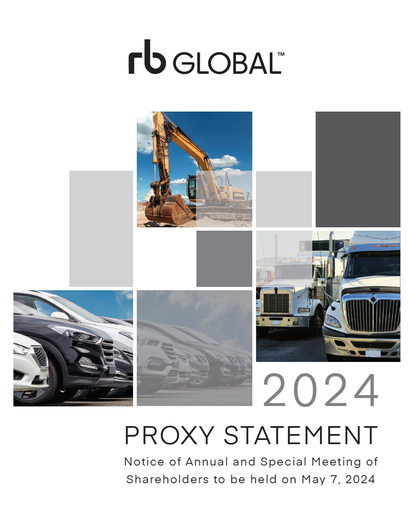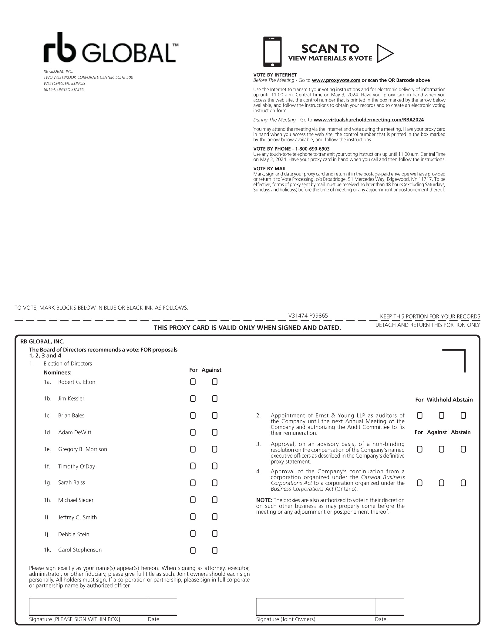 NOTICE IS HEREBY GIVEN that an Annual and Special Meeting (the “Meeting”) of the shareholders of RB GLOBAL, INC. (the “Company”) will be held in a virtual-only format on May 7, 2024 at 11:00 a.m. (Central Time), for the following purposes: