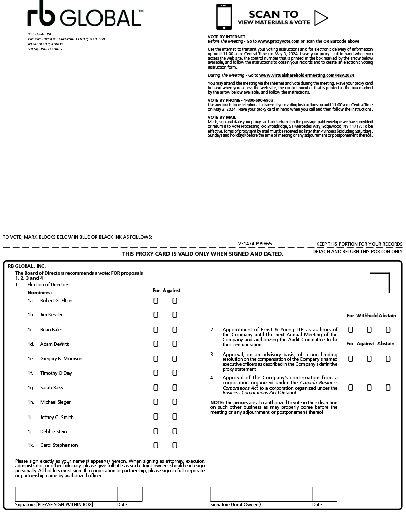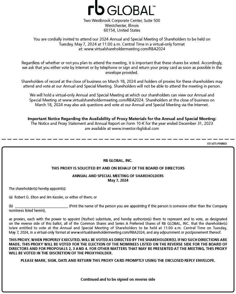 NOTICE IS HEREBY GIVEN that an Annual and Special Meeting (the “Meeting”) of the shareholders of RB GLOBAL, INC. (the “Company”) will be held in a virtual-only format on May 7, 2024 at 11:00 a.m. (Central Time), for the following purposes: