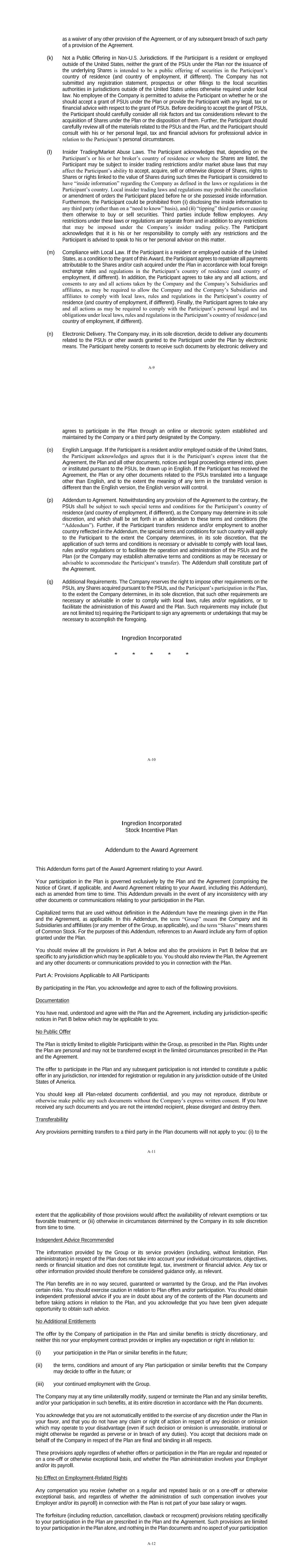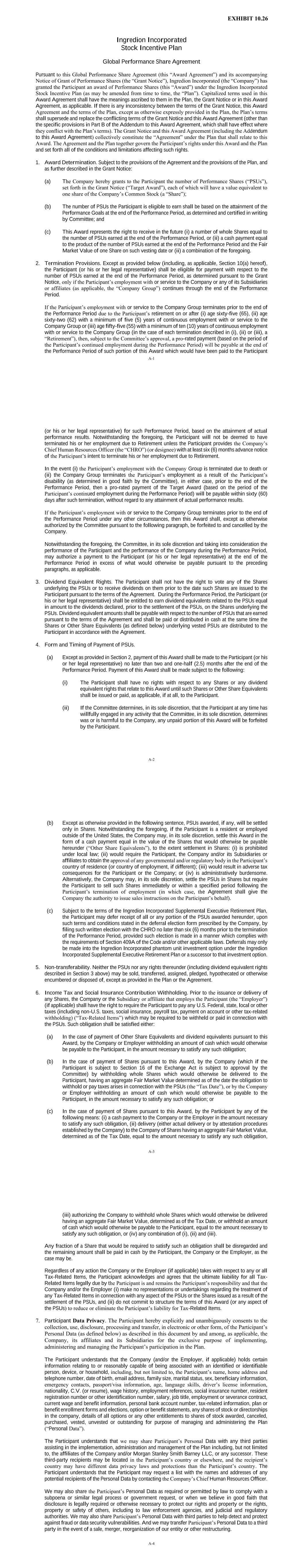 A-1 Ingredion Incorporated Stock Incentive Plan Global Performance Share Agreement Pursuant to this Global Performance Share Agreement (this “Award Agreement”) and its accompanying Notice of Grant of Performance Shares (the “Grant Notice”), Ingredion Incorporated (the “Company”) has granted the Participant an award of Performance Shares (this “Award”) under the Ingredion Incorporated Stock Incentive Plan (as may be amended from time to time, the “Plan”). Capitalized terms used in this Award Agreement shall have the meanings ascribed to them in the Plan, the Grant Notice or in this Award Agreement, as applicable. If there is any inconsistency between the terms of the Grant Notice, this Award Agreement and the terms of the Plan, except as otherwise expressly provided in the Plan, the Plan’s terms shall supersede and replace the conflicting terms of the Grant Notice and this Award Agreement (other than the specific provisions in Part B of the Addendum to this Award Agreement, which shall have effect where they conflict with the Plan’s terms). The Grant Notice and this Award Agreement (including the Addendum to this Award Agreement) collectively constitute the “Agreement” under the Plan that shall relate to this Award. The Agreement and the Plan together govern the Participant’s rights under this Award and the Plan and set forth all of the conditions and limitations affecting such rights. 1. Award Determination. Subject to the provisions of the Agreement and the provisions of the Plan, and as further described in the Grant Notice: (a) The Company hereby grants to the Participant the number of Performance Shares (“PSUs”), set forth in the Grant Notice (“Target Award”), each of which will have a value equivalent to one share of the Company’s Common Stock (a “Share”); (b) The number of PSUs the Participant is eligible to earn shall be based on the attainment of the Performance Goals at the end of the Performance Period, as determined and certified in writing by Committee; and (c) This Award represents the right to receive in the future (i) a number of whole Shares equal to the number of PSUs earned at the end of the Performance Period, or (ii) a cash payment equal to the product of the number of PSUs earned at the end of the Performance Period and the Fair Market Value of one Share on such vesting date or (ii) a combination of the foregoing. 2. Termination Provisions. Except as provided below (including, as applicable, Section 10(a) hereof), the Participant (or his or her legal representative) shall be eligible for payment with respect to the number of PSUs earned at the end of the Performance Period, as determined pursuant to the Grant Notice, only if the Participant’s employment with or service to the Company or any of its Subsidiaries or affiliates (as applicable, the “Company Group”) continues through the end of the Performance Period. If the Participant’s employment with or service to the Company Group terminates prior to the end of the Performance Period due to the Participant’s retirement on or after (i) age sixty-five (65), (ii) age sixty-two (62) with a minimum of five (5) years of continuous employment with or service to the Company Group or (iii) age fifty-five (55) with a minimum of ten (10) years of continuous employment with or service to the Company Group (in the case of each termination described in (i), (ii) or (iii), a “Retirement”), then, subject to the Committee’s approval, a pro-rated payment (based on the period of the Participant’s continued employment during the Performance Period) will be payable at the end of the Performance Period of such portion of this Award which would have been paid to the Participant A-2 (or his or her legal representative) for such Performance Period, based on the attainment of actual performance results. Notwithstanding the foregoing, the Participant will not be deemed to have terminated his or her employment due to Retirement unless the Participant provides the Company’s Chief Human Resources Officer (the “CHRO”) (or designee) with at least six (6) months advance notice of the Participant’s intent to terminate his or her employment due to Retirement. In the event (i) the Participant’s employment with the Company Group is terminated due to death or (ii) the Company Group terminates the Participant’s employment as a result of the Participant’s disability (as determined in good faith by the Committee), in either case, prior to the end of the Performance Period, then a pro-rated payment of the Target Award (based on the period of the Participant’s continued employment during the Performance Period) will be payable within sixty (60) days after such termination, without regard to any attainment of actual performance results. If the Participant’s employment with or service to the Company Group terminates prior to the end of the Performance Period under any other circumstances, then this Award shall, except as otherwise authorized by the Committee pursuant to the following paragraph, be forfeited to and cancelled by the Company. Notwithstanding the foregoing, the Committee, in its sole discretion and taking into consideration the performance of the Participant and the performance of the Company during the Performance Period, may authorize a payment to the Participant (or his or her legal representative) at the end of the Performance Period in excess of what would otherwise be payable pursuant to the preceding paragraphs, as applicable. 3. Dividend Equivalent Rights. The Participant shall not have the right to vote any of the Shares underlying the PSUs or to receive dividends on them prior to the date such Shares are issued to the Participant pursuant to the terms of the Agreement. During the Performance Period, the Participant (or his or her legal representative) shall be entitled to earn dividend equivalents related to the PSUs equal in amount to the dividends declared, p