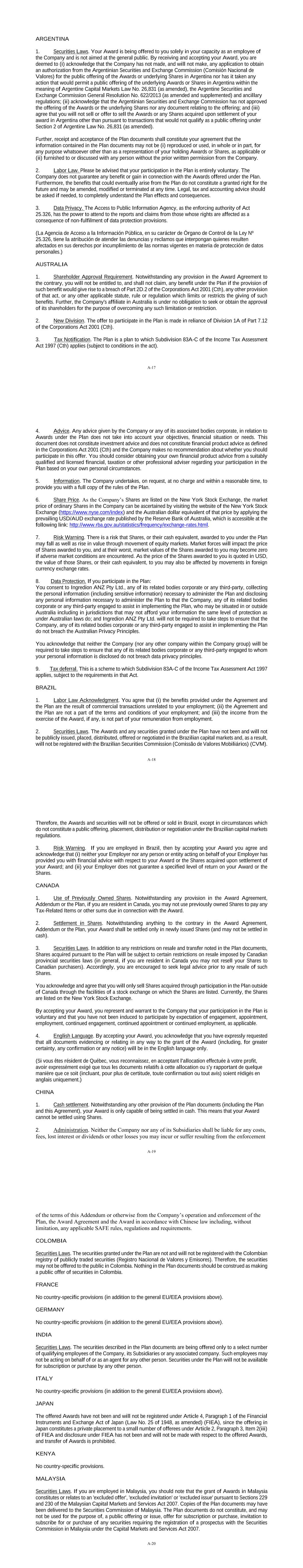 A-21 MEXICO 1. Commercial Relationship. You expressly recognize that your participation in the Plan and the Company’s grant of the Award does not constitute an employment relationship between you and the Company. You have been granted the Award as a consequence of the commercial relationship between the Company and the Company’s affiliate in Mexico that employs you, and the Company’s local affiliate in Mexico is your sole Employer. Based on the foregoing, (a) you expressly recognize the Plan and the benefits you may derive from your participation in the Plan do not establish any rights between you and the Company’s affiliate in Mexico that employs you, (b) the Plan and the benefits you may derive from your participation in the Plan are not part of the employment conditions and/or benefits provided by the Company’s affiliate in Mexico that employs you, and (c) any modifications or amendments of the Plan by the Company, or a termination of the Plan by the Company, shall not constitute a change or impairment of the terms and conditions of your employment with the Company’s affiliate in Mexico that employs you. 2. Extraordinary Item of Compensation. You expressly recognize and acknowledge that your participation in the Plan is a result of the discretionary and unilateral decision of the Company, as well as your free and voluntary decision to participate in the Plan in accordance with the terms and conditions of the Plan and the Agreement including this Addendum. As such, you acknowledge and agree that the Company may, in its sole discretion, amend and/or discontinue your participation in the Plan at any time and without any liability. The value of the Award is an extraordinary item of compensation outside the scope of your employment contract, if any. The Award is not part of your regular or expected compensation for purposes of calculating any severance, resignation, redundancy, end of service payments, bonuses, long- service awards, pension or retirement benefits, or any similar payments, which are the exclusive obligations of the Employer. 3. Securities Laws. The Shares underlying your Award have not been registered with the National Register of Securities maintained by the Mexican Banking and Securities Commission and may not be offered or sold publicly in Mexico. The Plan documents may not be publicly distributed in Mexico. These materials are addressed to you only because of your existing labor relationship with the Group and may not be reproduced or copied in any form. The offer contained in these materials is addressed solely to the present employees of the Group in Mexico and any rights under the Plan may not be assigned or transferred. The Shares underlying your Award will be offered pursuant to a private placement exception under the Mexican Securities Law. NETHERLANDS No country-specific provisions (in addition to the general EU/EEA provisions above). PAKISTAN Mandatory Cashless Sell-All Exercise for Options. Notwithstanding any provision in the Agreement or Plan to the contrary, unless and until the Committee determines otherwise, the method of exercise of the Award shall be limited to mandatory cashless, sell-all exercise. PERU 1. Labor Law Acknowledgement. By accepting the grant of the Award, you acknowledge, understand and agree that the Award is being granted ex gratia to you with the purpose of rewarding you. A-22 2 Securities Laws. If you are employed in Peru, the following statement is hereby made part of the Plan documents: the Shares to be issued upon settlement of your Award have not been registered with the Public Register of the Securities Market maintained by the Peruvian Securities Market Superintendence (Superintendencia del Mercado de Valores - SMV), and may not be offered or sold publicly in Peru. In addition, the contents of the Plan documents have not been reviewed by any Peruvian regulatory authority. RUSSIA Securities Laws. Information contained in the Plan documents does not constitute an advertisement of any securities in Russia and must not be passed on to third parties or otherwise be made publicly available in Russia. The Awards and the details of the Shares to be granted under the Plan have not been and will not be registered in Russia and are not intended for 'placement' or 'circulation' in Russia. SINGAPORE Securities Laws. You acknowledge that no Plan documents have been registered as a prospectus with the Monetary Authority of Singapore. Accordingly, the Plan documents and any other document or material in connection with the offer or sale, or invitation for subscription or purchase of the Shares used pursuant to the Plan may not be circulated or distributed, nor may the Shares be offered or sold, or be made the subject of an invitation for subscription or purchase, whether directly or indirectly, to persons in Singapore other than pursuant to, and in accordance with the conditions of, an exemption under any provision (other than Section 280) of Subdivision (4) of Division 1 of Part XIII of the Securities and Futures Act, Chapter 289 of Singapore. The Awards are prescribed capital markets products (as defined in the Securities and Futures (Capital Markets Products) Regulations 2018) and Excluded Investment Products (as defined in MAS Notices SFA 04-N12 and FAA-N16). SOUTH AFRICA 1. Exchange Control Obligations. You are solely responsible for complying with applicable exchange control regulations and rulings (the “Exchange Control Regulations”) in South Africa. As the Exchange Control Regulations change frequently and without notice, you should consult your legal advisor prior to the acquisition or sale of Shares under the Plan to ensure compliance with current Exchange Control Regulations. Neither the Company nor any of its Subsidiaries or affiliates will be liable for any fines or penalties resulting from your failure to comply with applicable laws. 2. Securities Laws and Acceptance of the Award. Neither the Award nor the underlyin